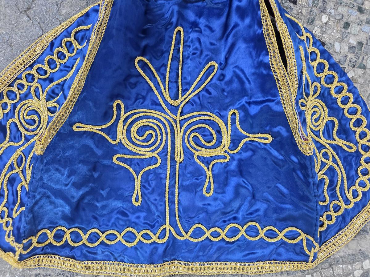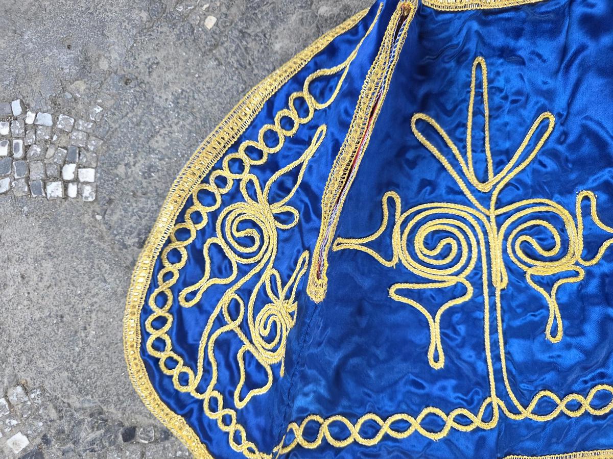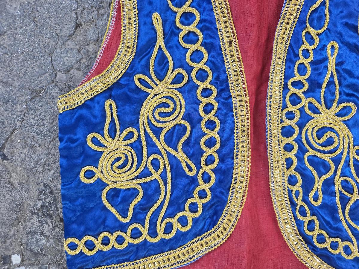 This is a lovely authentic, vintage Albanian kid's traditional vest, beautifully crafted with rich blue plush and intricate gold embroidery. This striking piece is classic example of Balkan folk costume, traditionally worn for celebrations, ceremonies and cultural events.