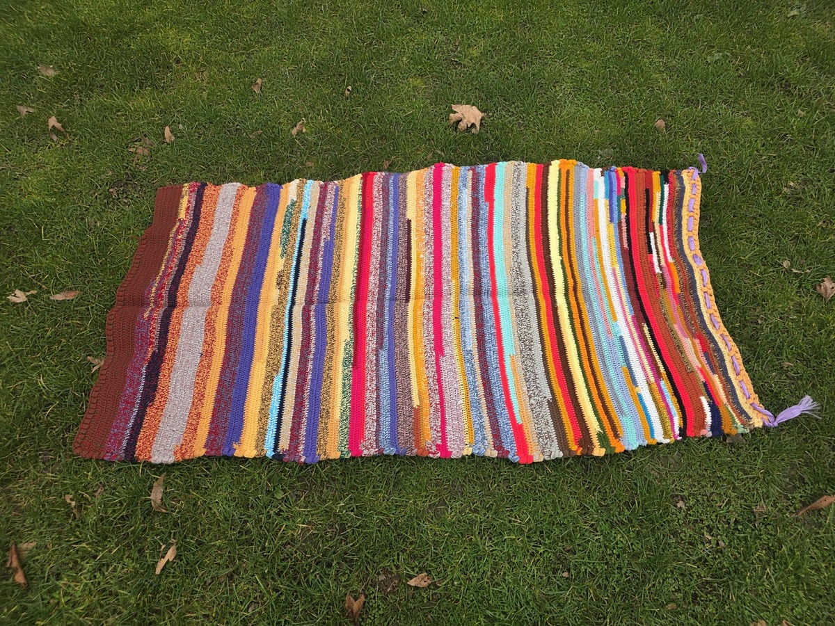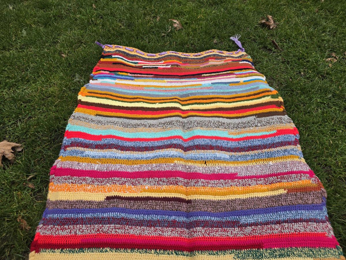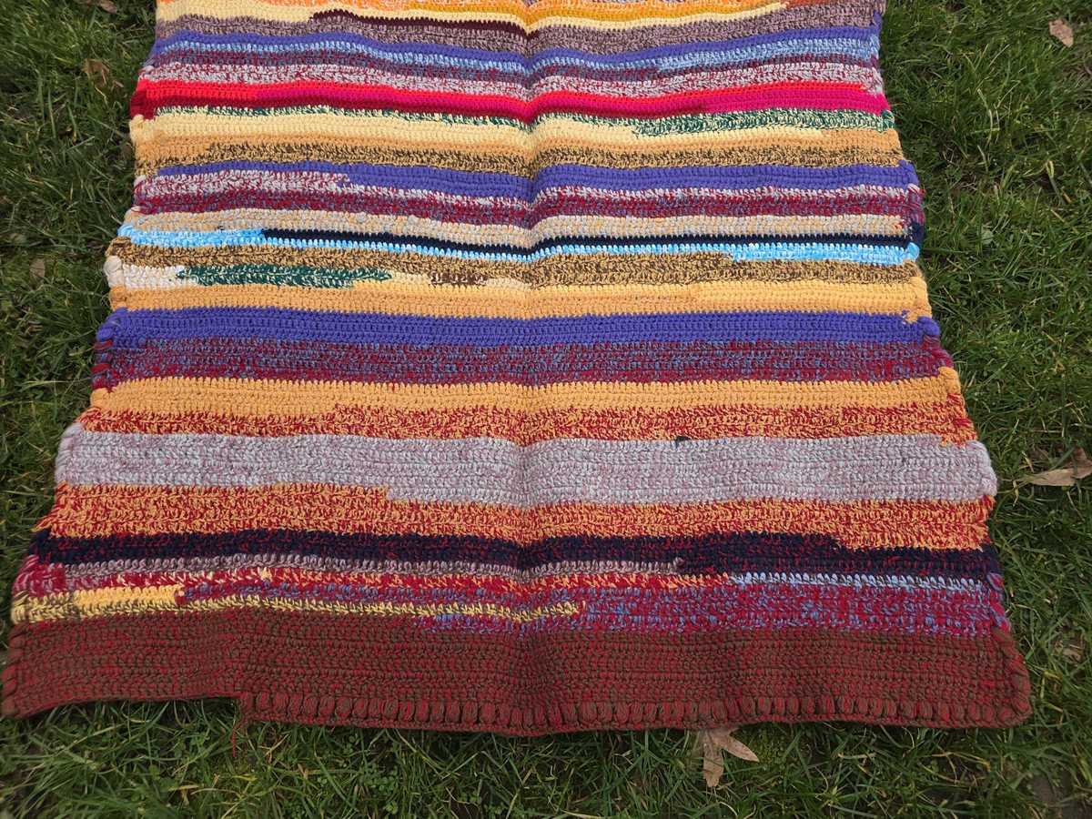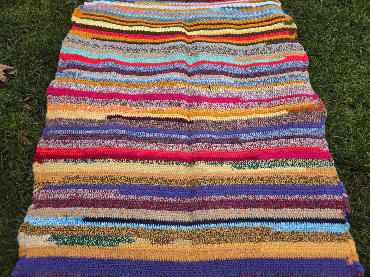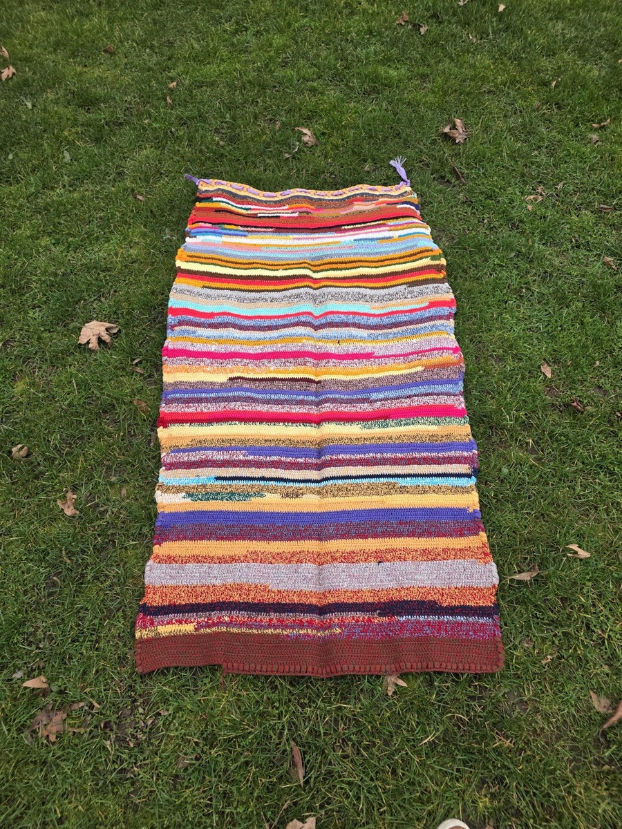 Colorful runner rug, mid-century hand knitted acrylic wool multi-colored runner