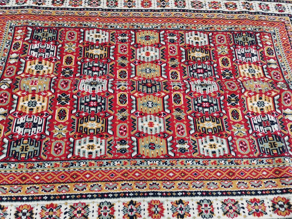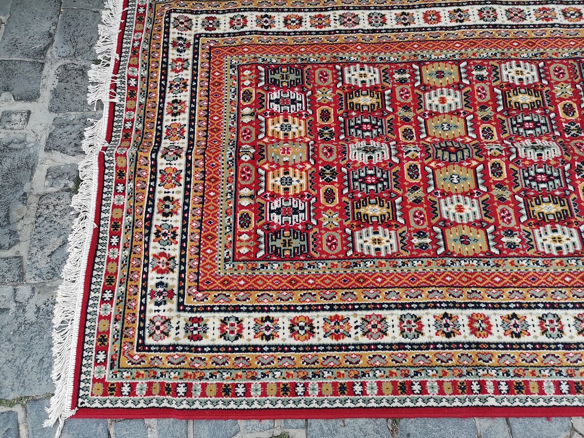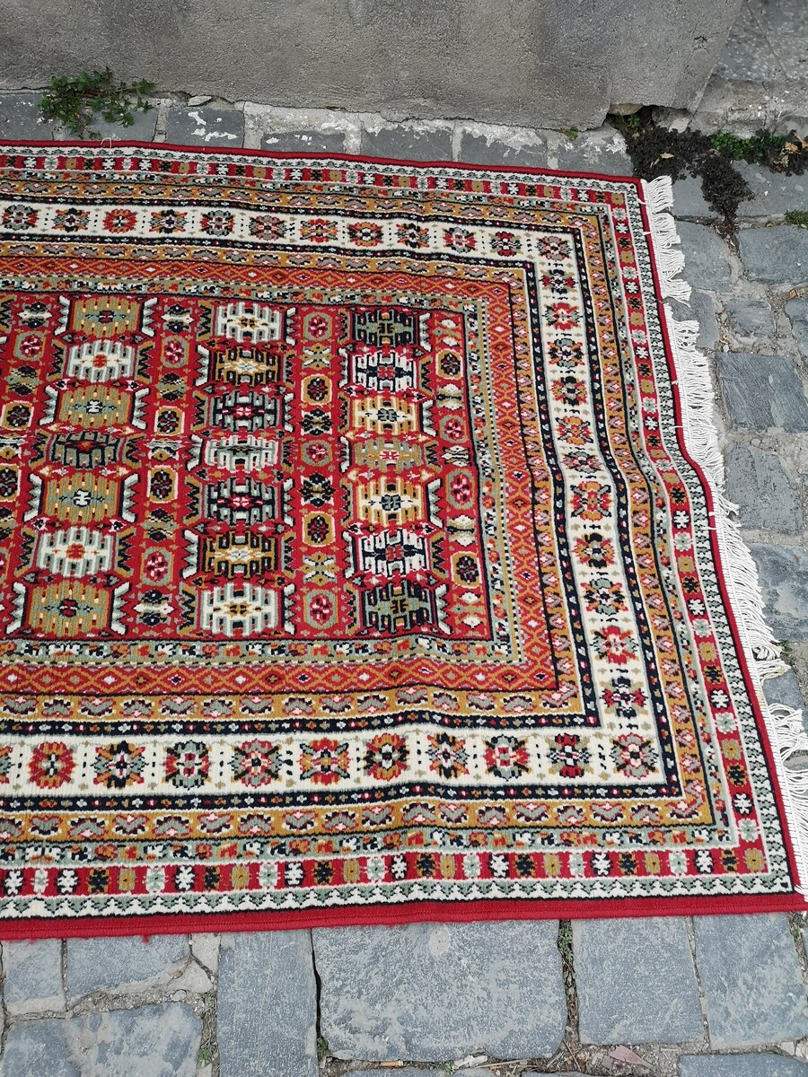 Beautiful vintage carpet, Moroccan style carpet made in Italy in the 1970's. High quality carpet for every home or office, easy to fit in your home decor. Kept in a very good condition with a small damage at one side (missing small part of the laces about 5 cm or 2"), except for that is in a excellent condition.