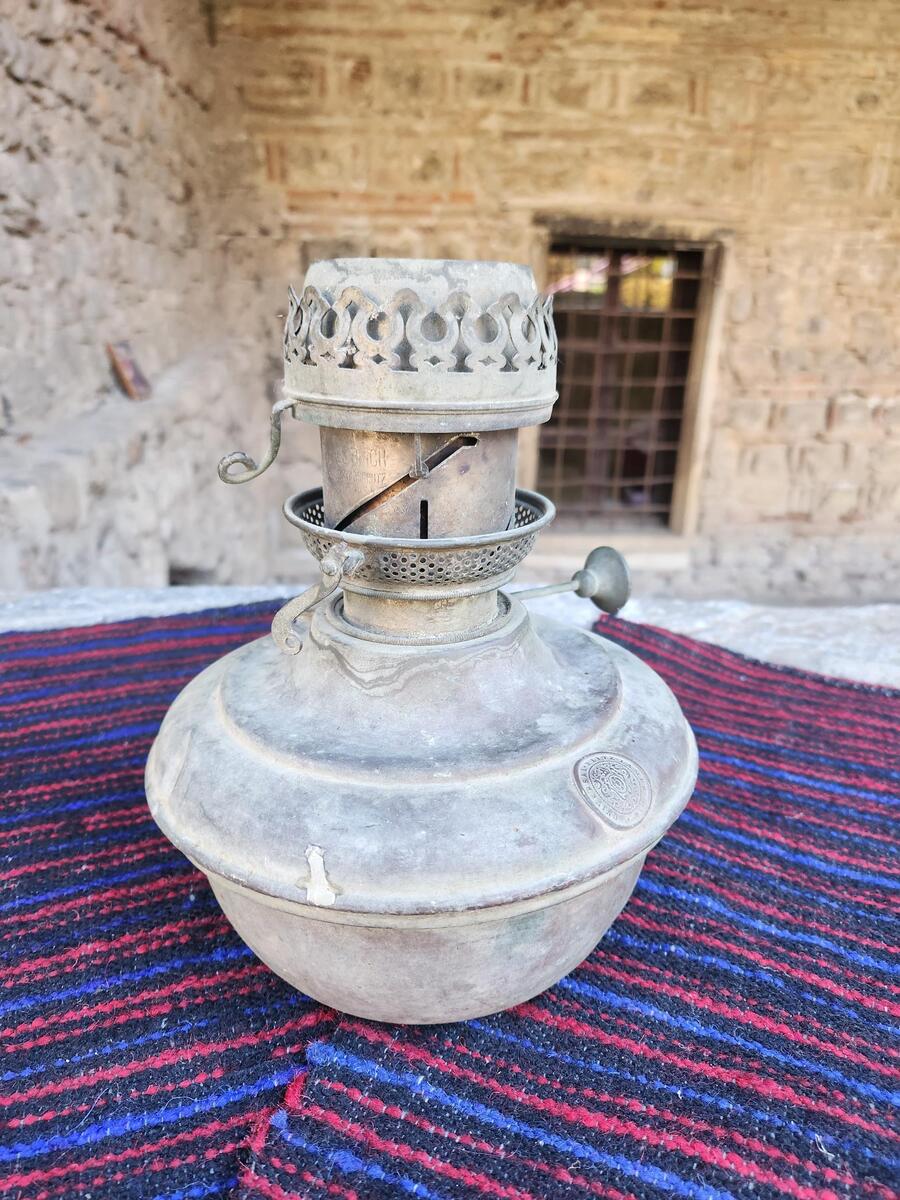 The lamp is made of brass. It is kept in a good condition for its age and is not modified, it is in original state and condition, kept its authenticity and true primitive and rustic touch. At the same time not losing a bit of its collectible value.