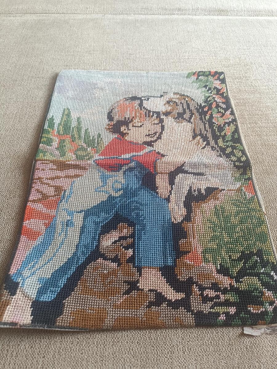Vintage Needlepoint Tapestry: Boy and Dog, Hand-Embroidered Art