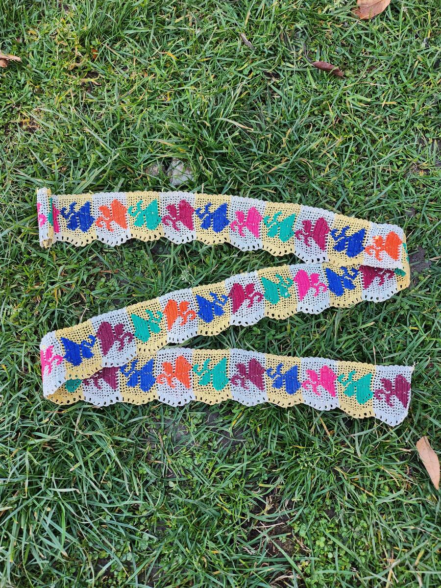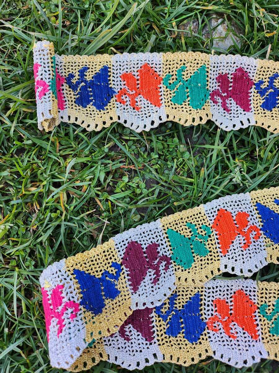 This is a lovely looking, handmade, hand knitted lace made in the middle of the XX century. It is a colorful handmade patch that was used as a decor on a woman's sash as part of the decorative pieces at some folklore costumes in some villages in the western part of Macedonia at the time.