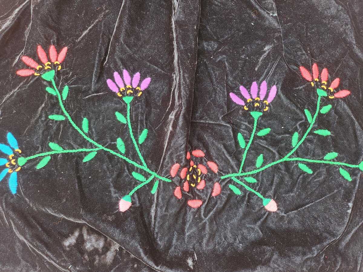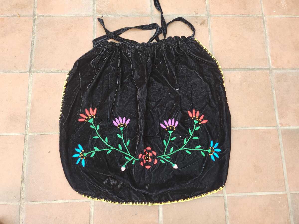 This is a vintage apron from the middle of the XX century. The apron is made of velvet and has a nice looking floral embroidery as decor on it. It is in black colour. The apron was used in that time as part of the everyday wear by the housewives in Macedonia who were living in the urban areas.