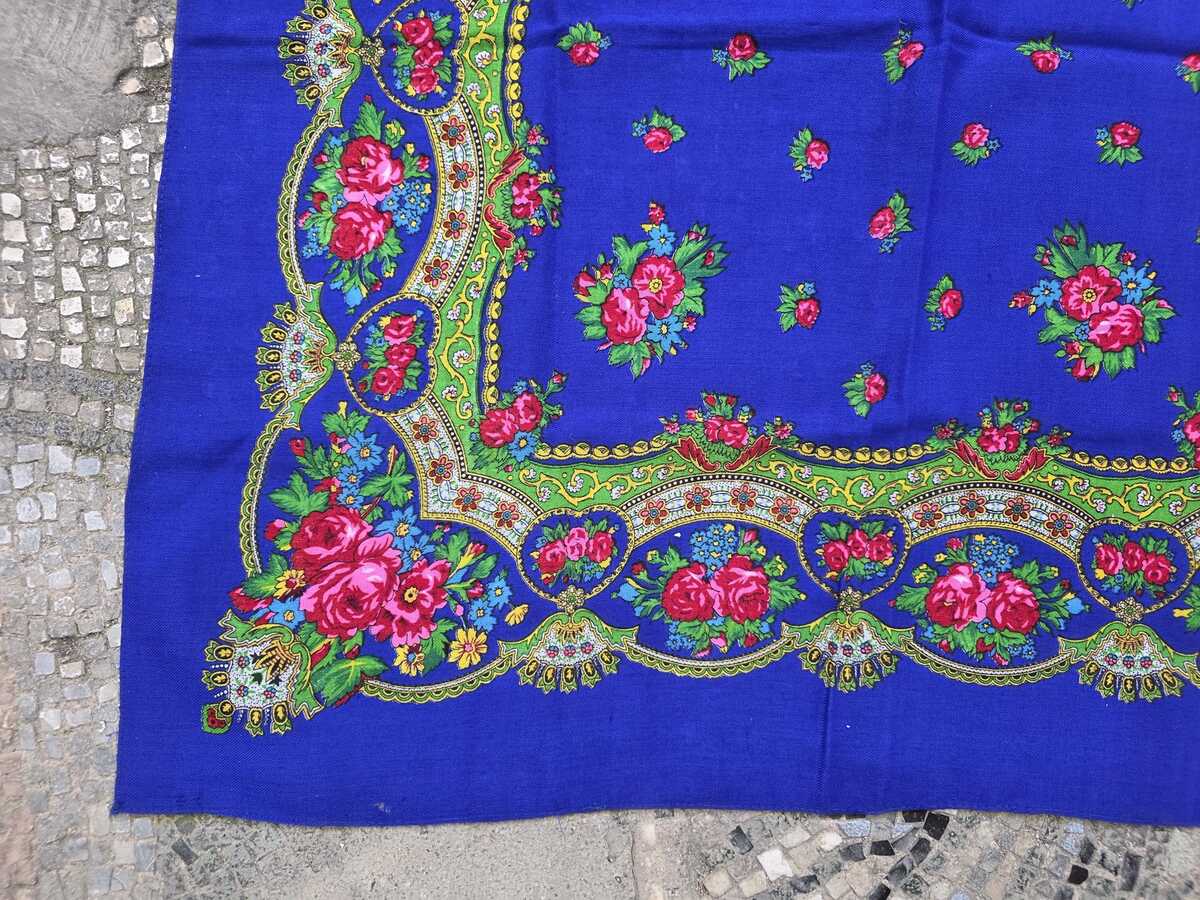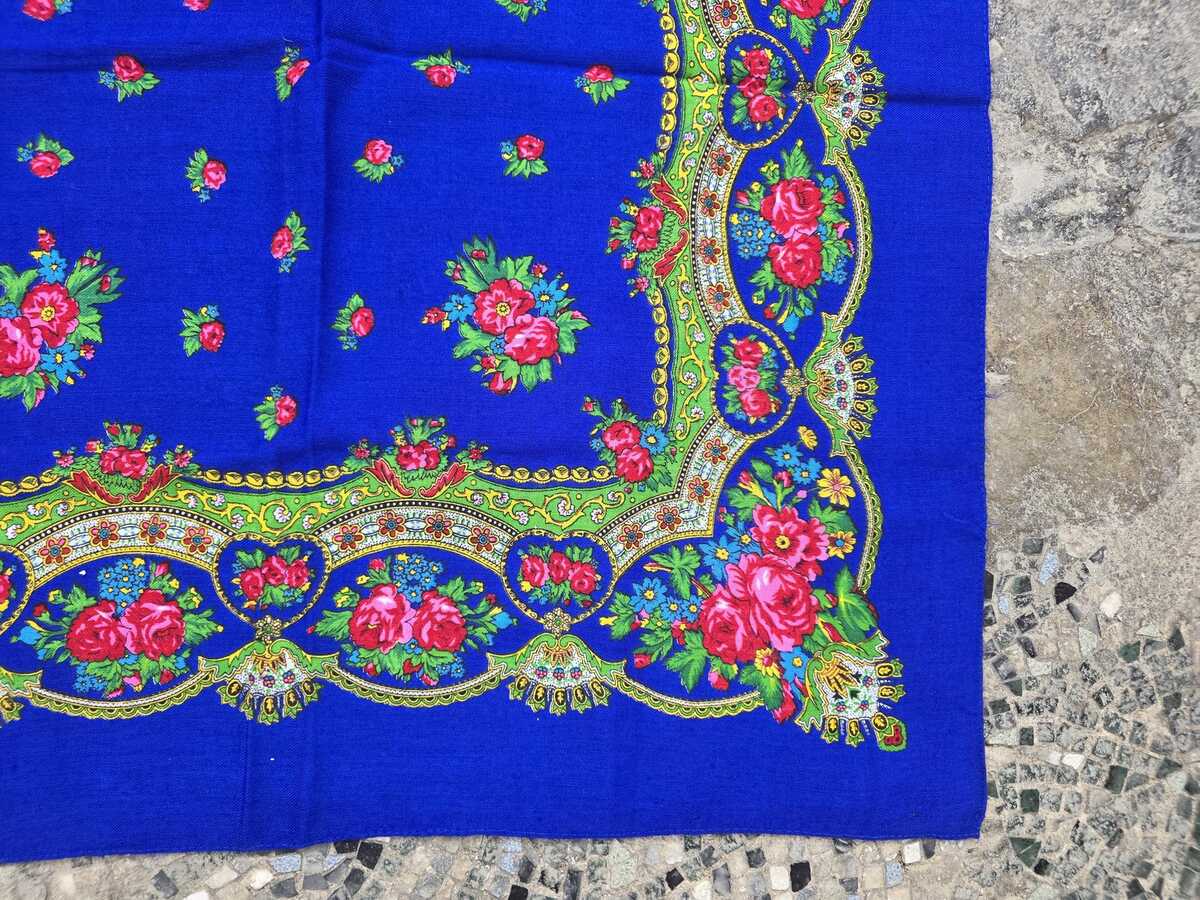 Blue floral headscarf, traditional folk women's scarf, Slavic ethnic shawl