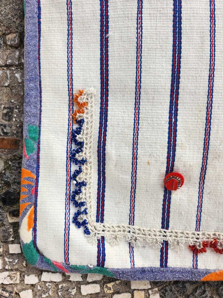 This is a completely handmade apron, made in the first half of the XX century. The apron is made of natural and pure cotton, hand woven on a loom. This is an atypical apron from the Prilepsko pole villages, because is used cotton in the weaving process (not wool as usual) and was part of a women's folklore costume from the villages of Prilepsko pole at the time.