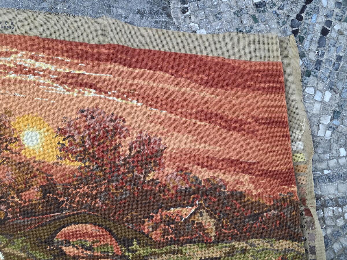 Hand embroidered vintage tapestry, finished needlepoint, Sunset, retro wall deco