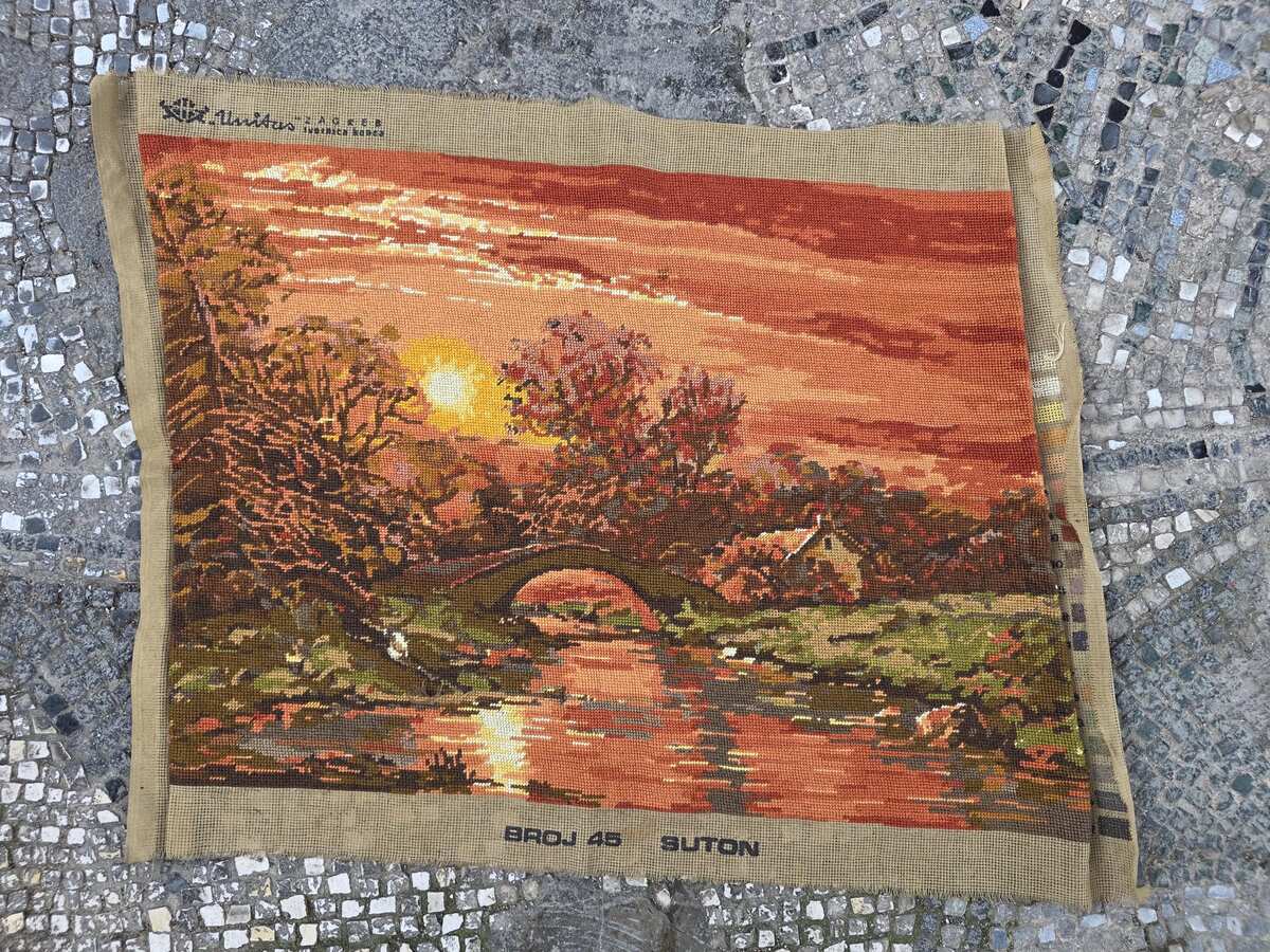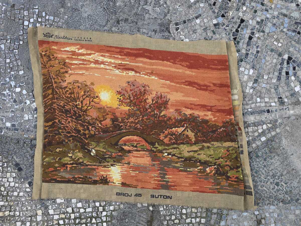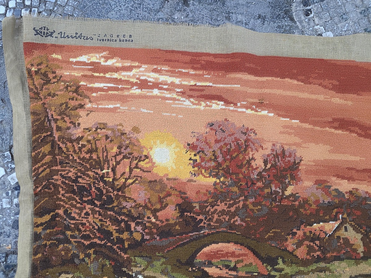 This is a lovely hand embroidered, needlepoint (petit point), tapestry with a true retro charm. It is a picture of Sunset, needlepointed on a canvas, manufactured by Unitas Threads in Zagreb, Croatia, as part of the former Republic of Yugoslavia.