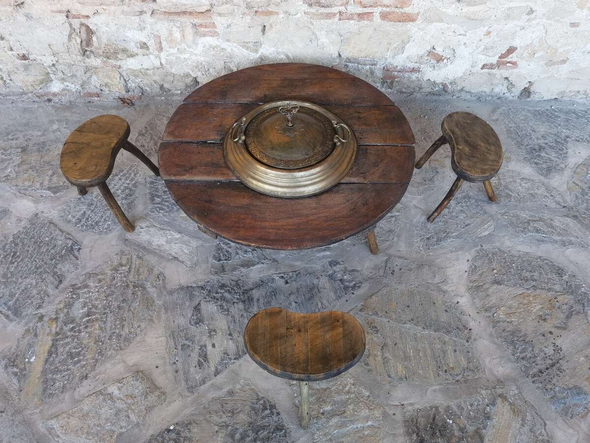 This is a unique, extremely rare and one of a kind item from the Ottoman Era, middle of the XIX century. It is a incense burner or a heater used by the Ottomans also known by its Ottoman name 'Mangal'. This exact one is complete set with a table and three stools. The heater is made of copper and the table and the stools made of wood. It is preserved in excellent condition or their age, with visible few signs of age on the table.