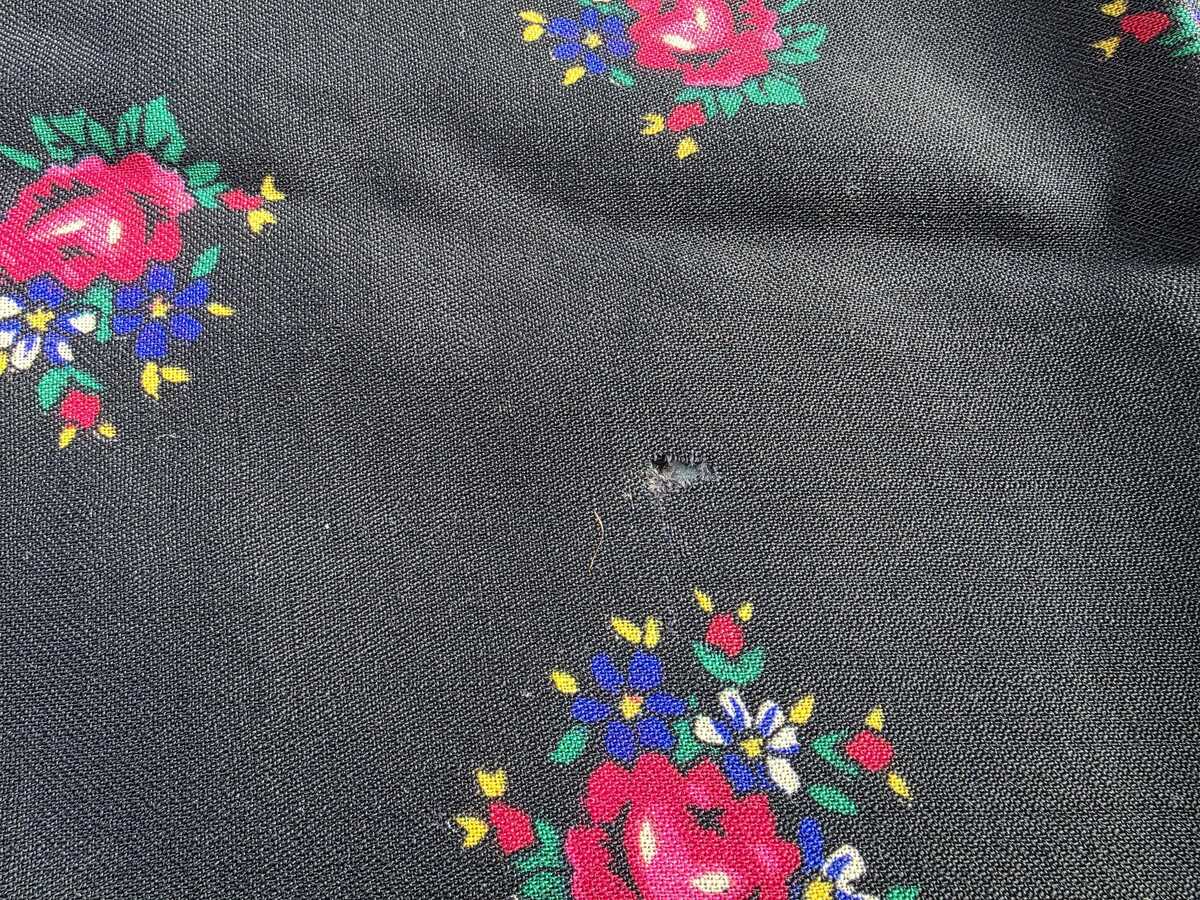 This is a vintage floral scarf feautiring a black background adorned with rich floral motifs, roses, wildflowers and lush greenery.