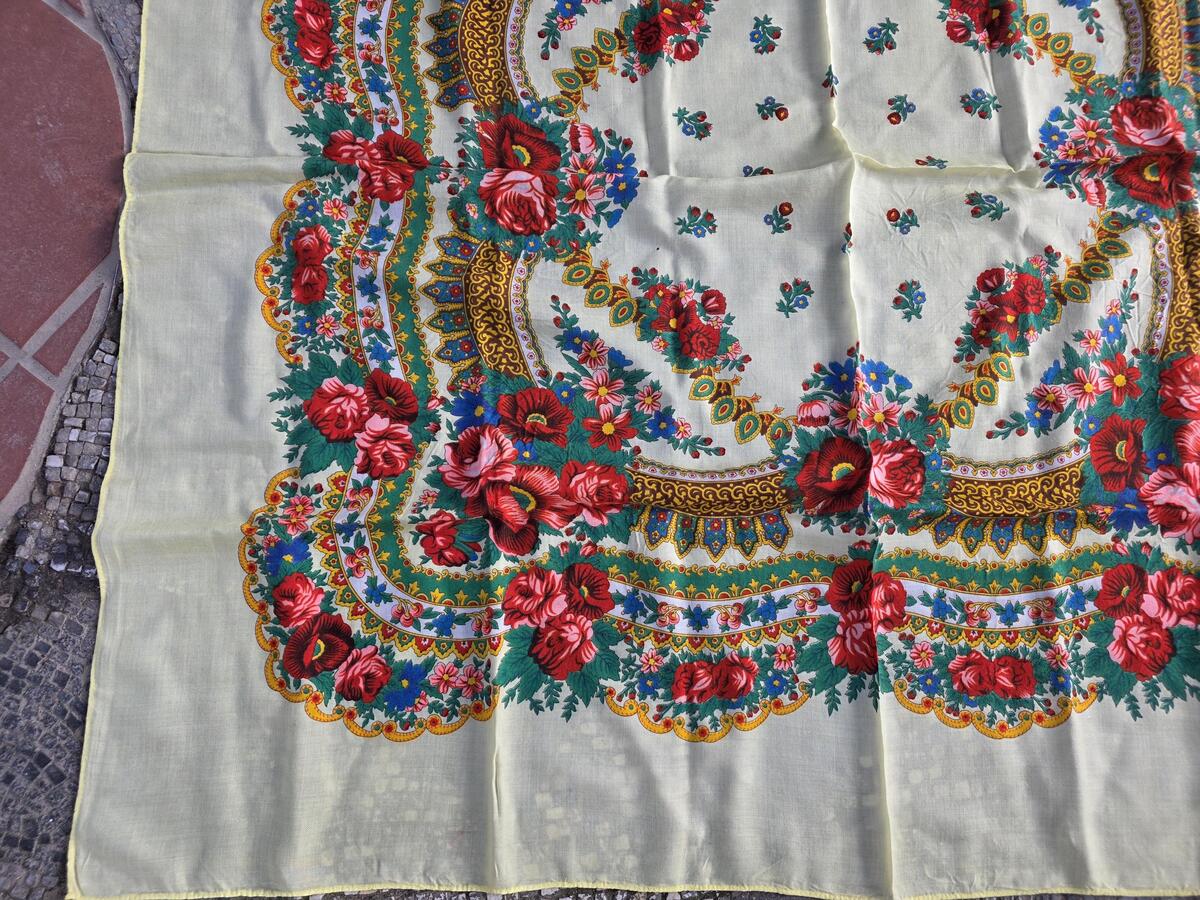 This scarf reflects traditional Eastern European folk aesthetics and is perfect as a headscarf, shawl, wall decor, table accent or costume accessory.