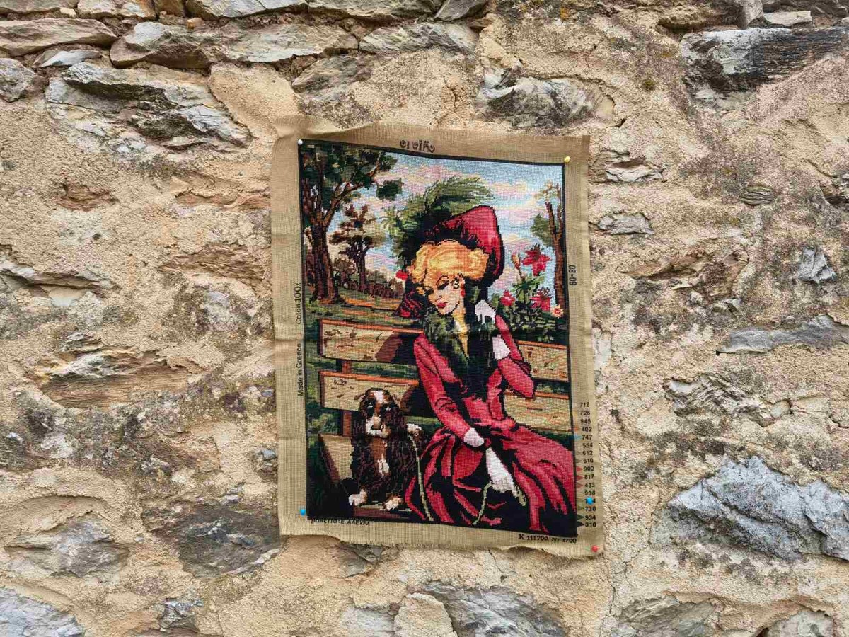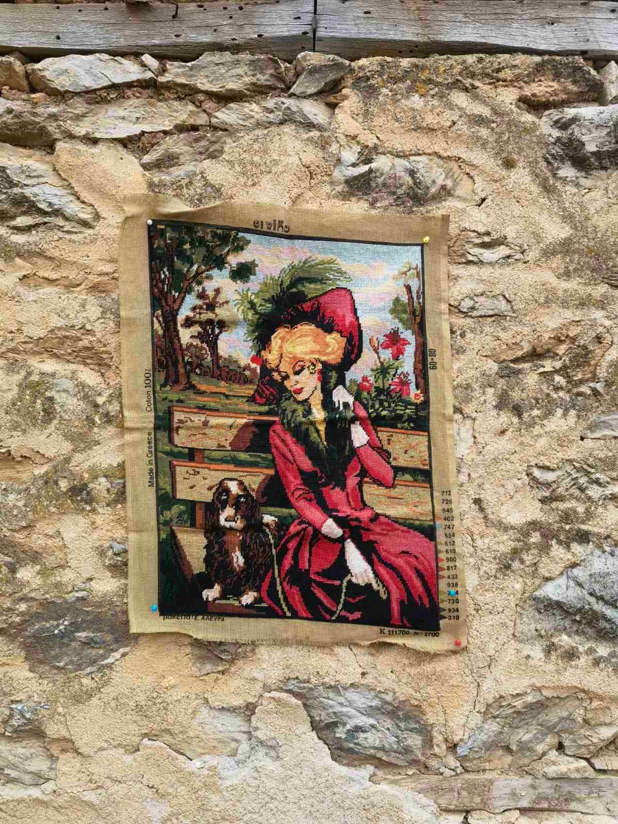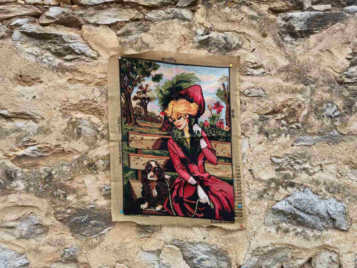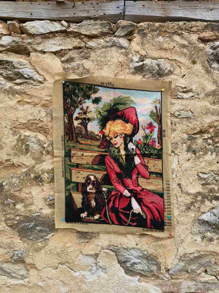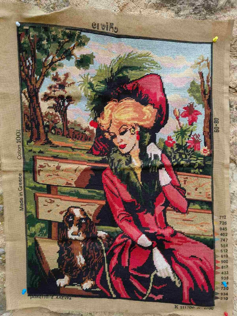 It is beautiful looking gobelin needlepoint, precise and nice picture of a lady and her dog sitting in a nature on a bench. The gobelin is made of high quality 100 % cotton thread. It is a Greek gobelin. The gobelin goes without a frame.