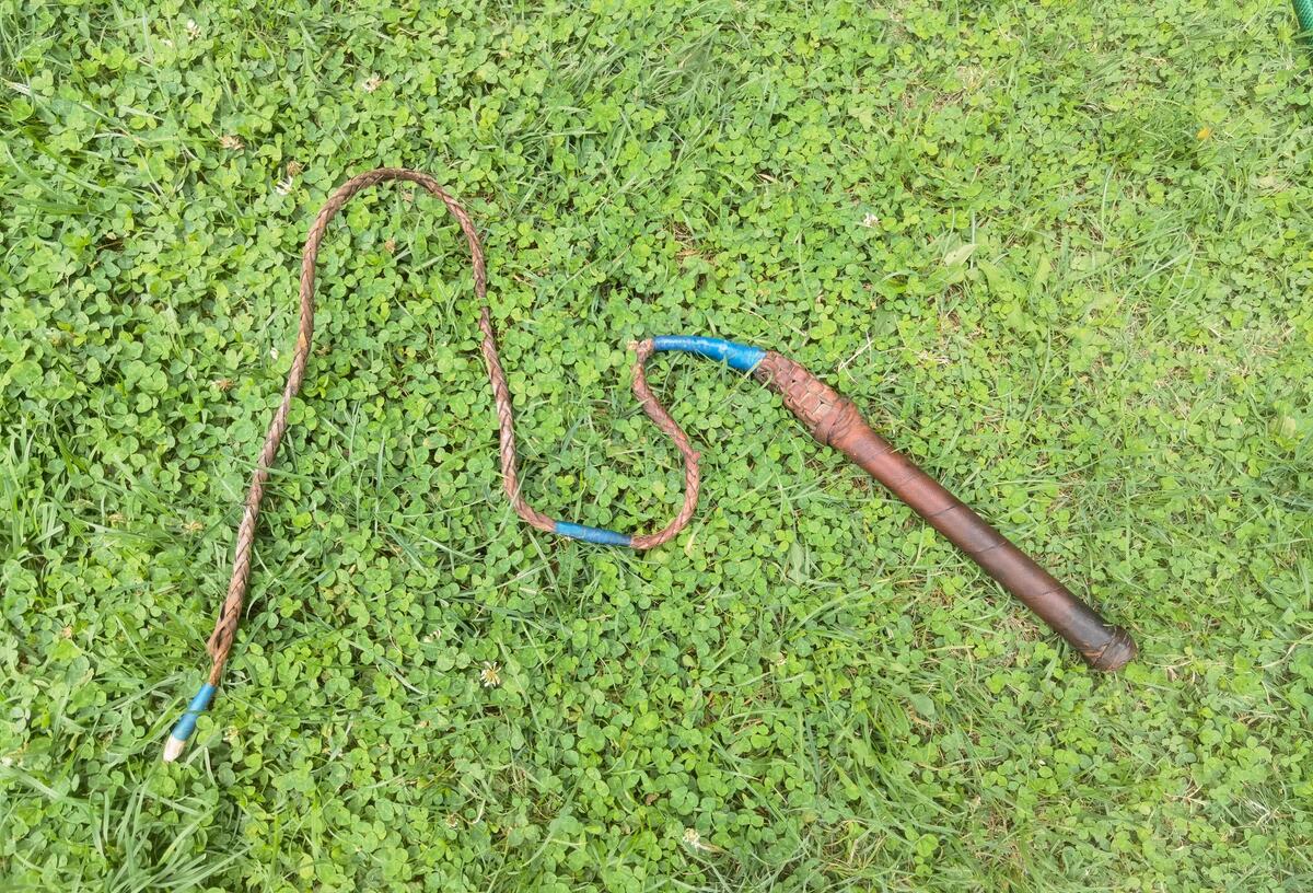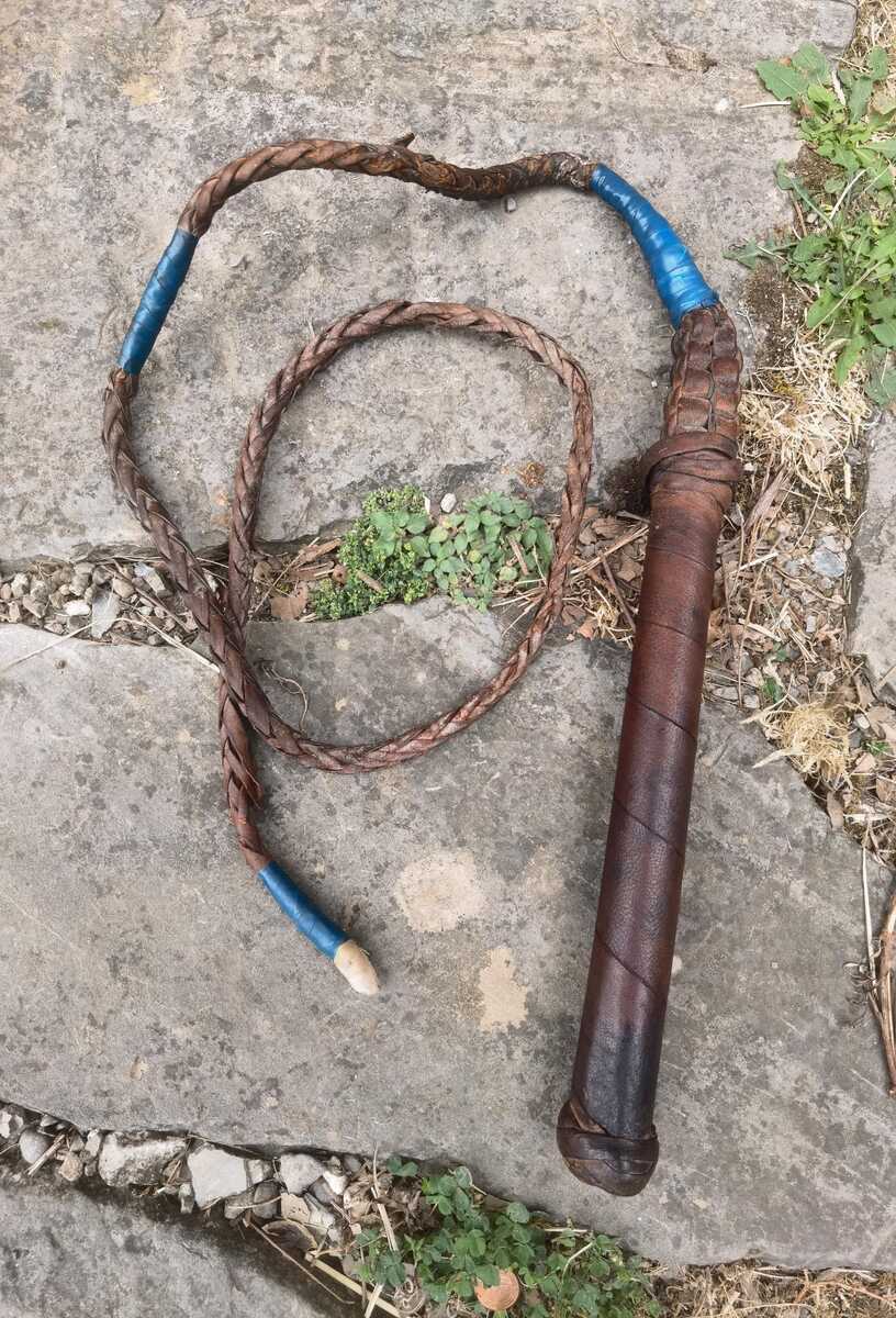 This is a handmade leather whip, hand knitted. The whip was made in the middle of the last century in Macedonia. By the size it was probably a bull whip. The overall length of the whip (the handle included) is 139 cm or in inches 54.7''.