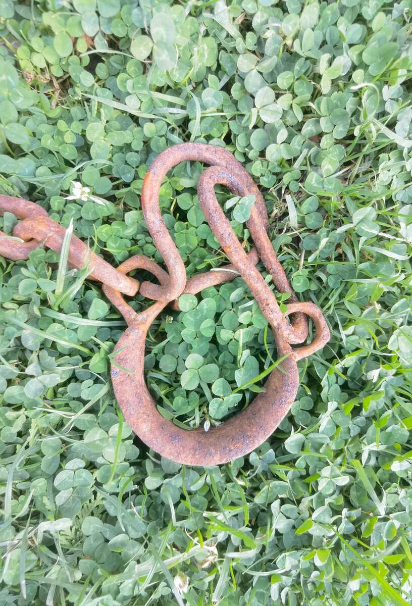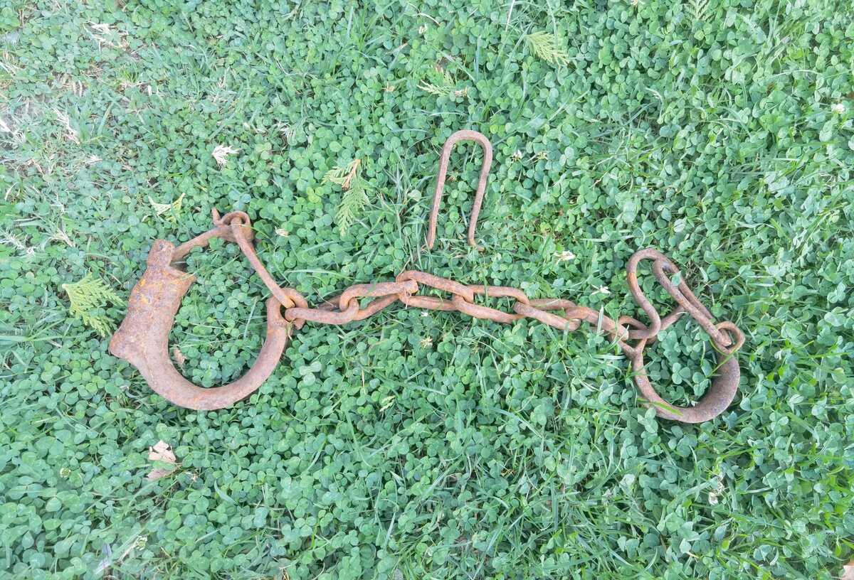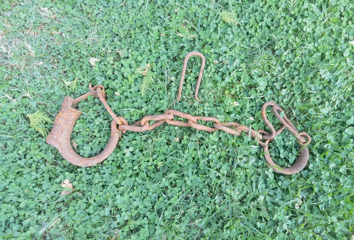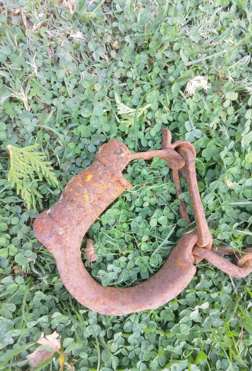 Antique iron forged prisoner leg cuff angle single chain, primitive, authentic