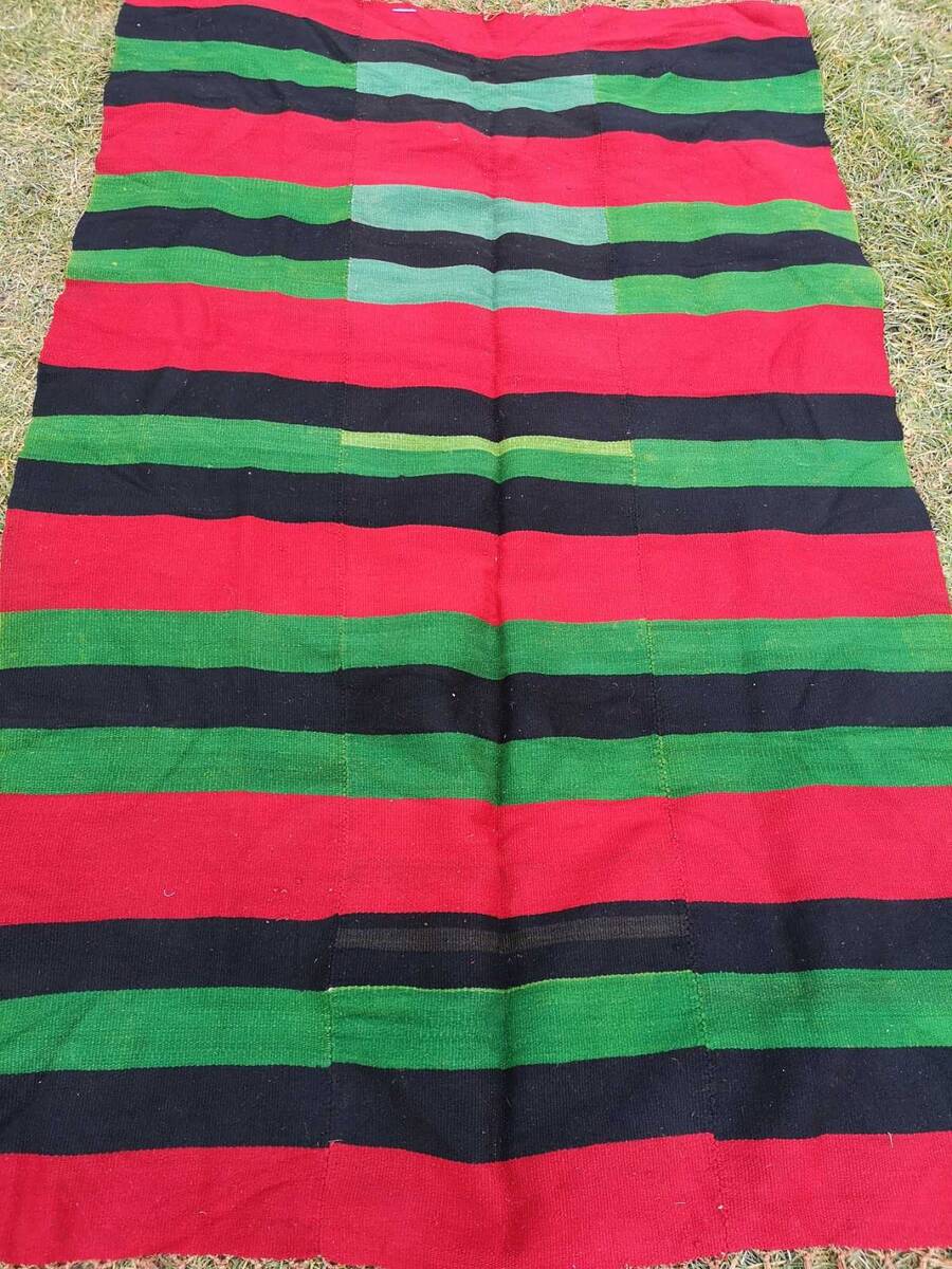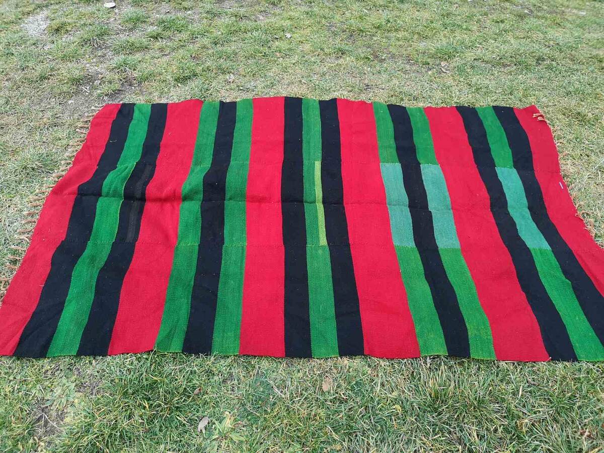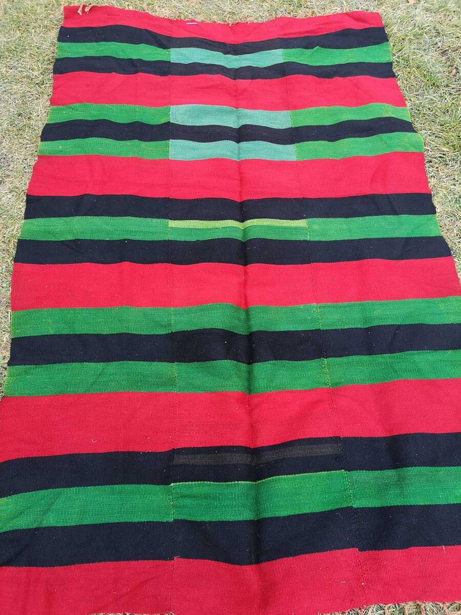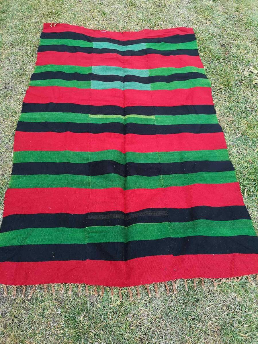 This is a handmade rug, made in the beginning of the XX century. The rug s kept in a very good antique condition, without damages of any kind. The colors are in great shape, not faded at all. The rug was made of natural and organic wool, hand woven on a horizontal loom. The rug is made of three equal pieces, also known as kilim pictures, and they are sewn together. The pattern and design is typical for the traditional ethnic fabric creations in the Balkan and Macedonia in the XIX and XX century.
