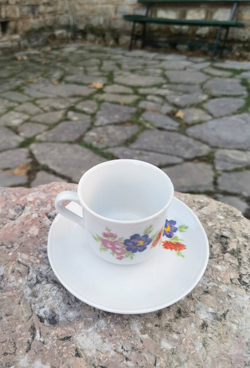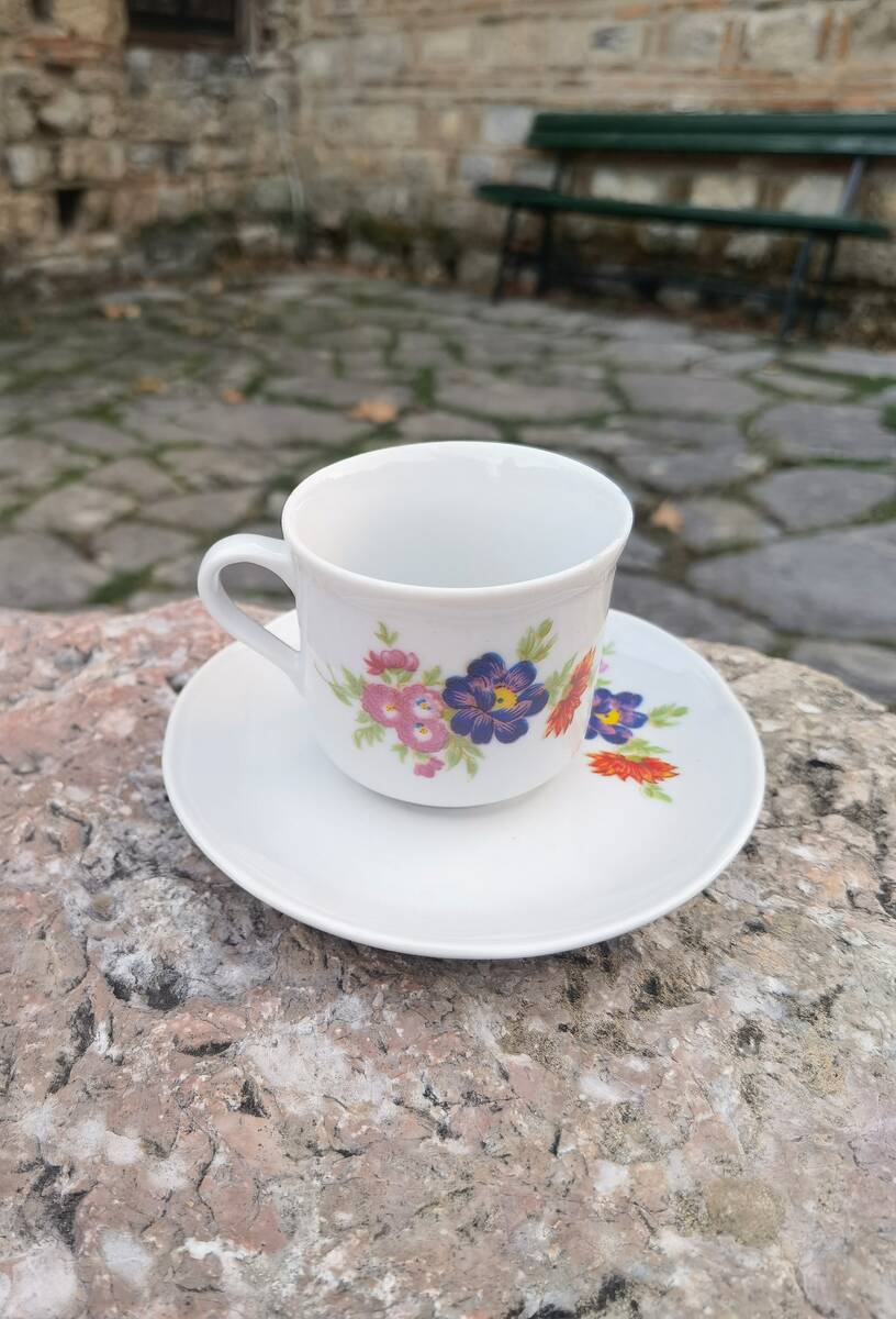 This is a complete set of six cups and six saucers made of high quality porcelain for Turkish coffee or espresso. The set was made in the 1970's in Boris Kidric porcelain factory in the former Republic of Yugoslavia. It is made by the very well known high standards of quality in Yugoslavia.
