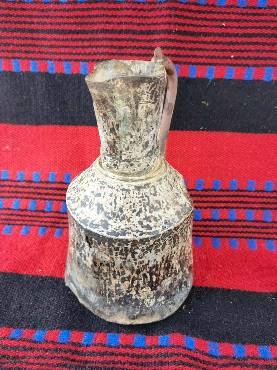 This is a metal pitcher made in the second half of the XIX century, the period of the Ottoman Empire. It is a metal pitcher with a height of 25 cm. It has many scares from the time and age as you can see at the photos, it sells as is. The pitcher has authentic primitive look and can be lovely part of your home or garden rustic and primitive decor.