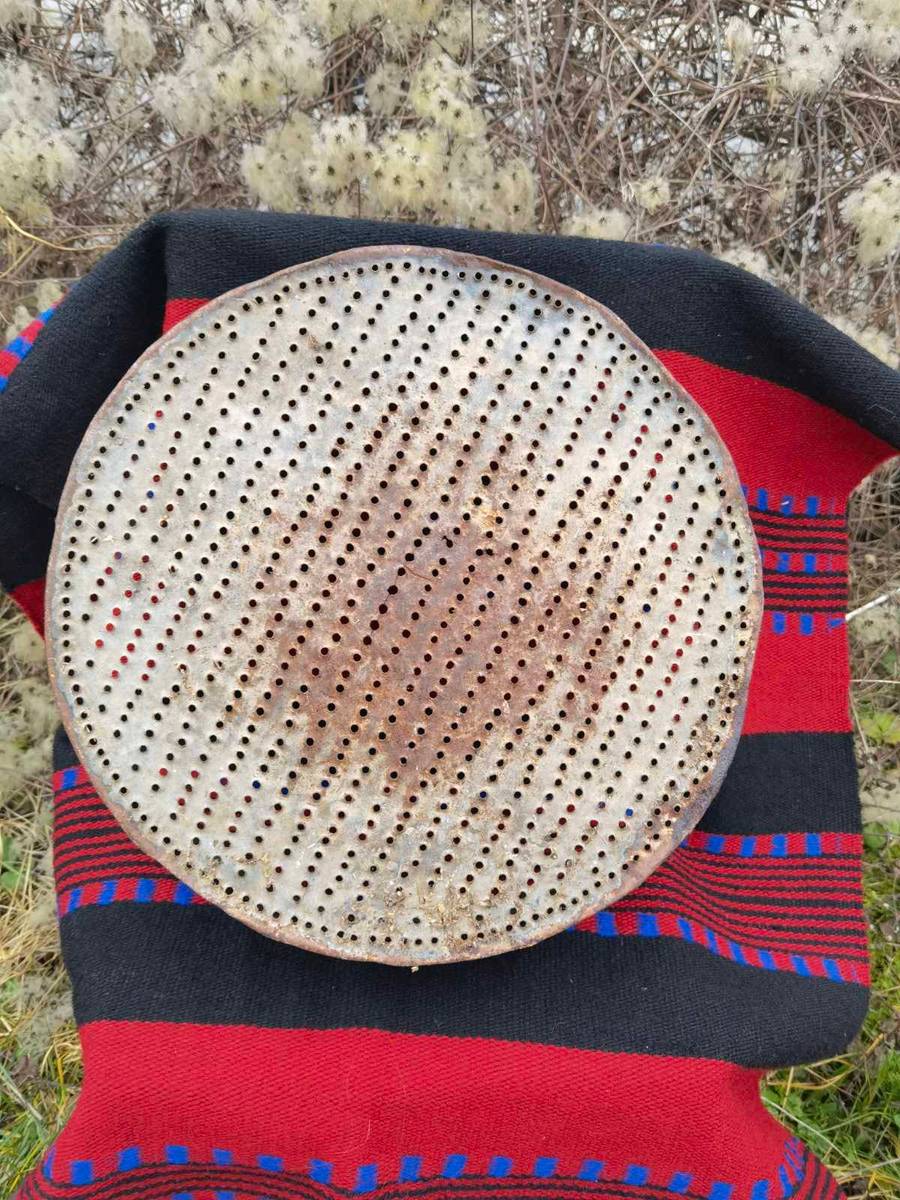 This is an old, primitive and used sieve. It was made of metal, probably iron, and was handmade. It was made somewhere in the middle of the first half of the XX century. There are signs of rust on it, and the shape is little deformed at the edges as you can see at the photos. Please enlarge the photos and take a close look at them, the sieve sells as is.
