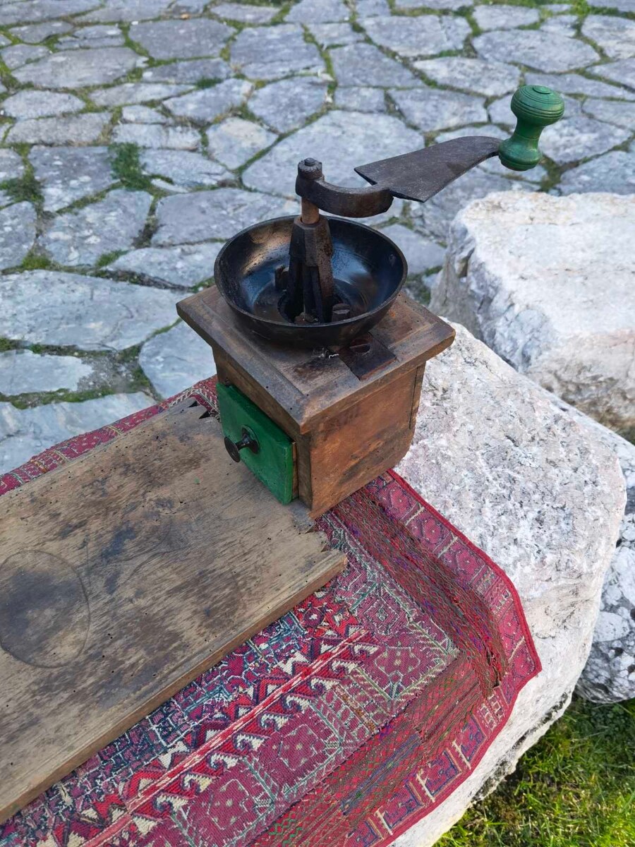 This is an antique coffee grinder made and used in the XIX century. The grinder is at least 120 years old. It is from the Ottoman period, while the Ottoman Empire was in control on most of the Balkan. The grinder is kept in a good antique condition and is functional. On the surface of the wooden parts of the grinder are visible holes made by wood warms which is normal for its age and not protected in that time with some chemicals. The grinder has a small crack at the backside, visible at the photos, but it doesn't effect the working of the grinder or the image of it.