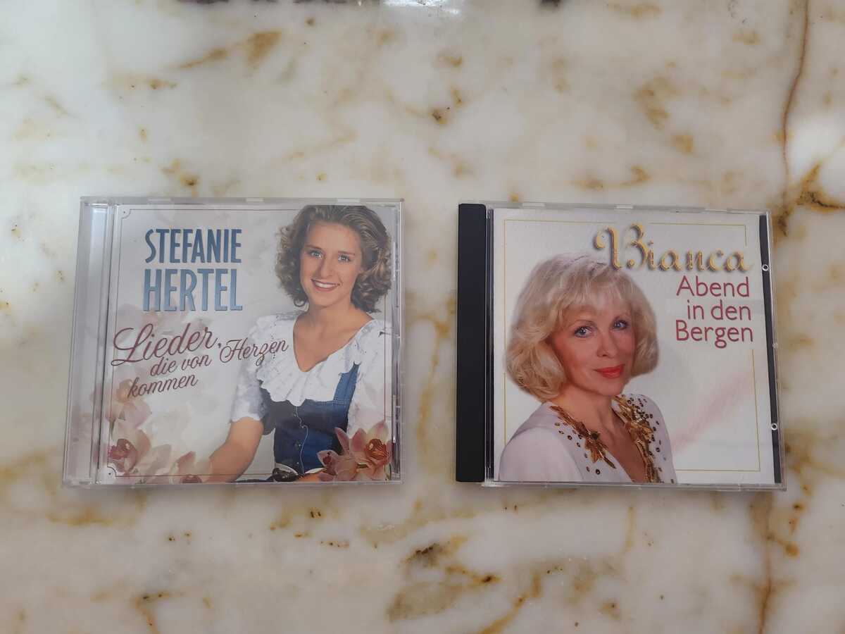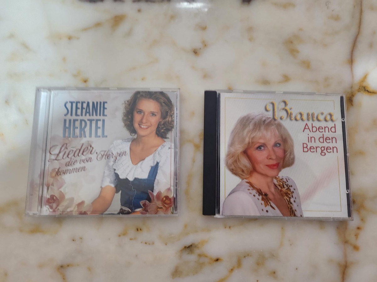 This is a set of two vintage CD's with German folk music. One is by Stefanie Hertel titled as Lieder, die von Herzen kommen and the other is by Bianca titled as abend in den Bergen.