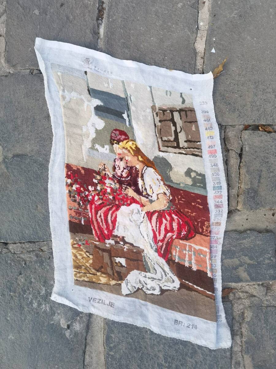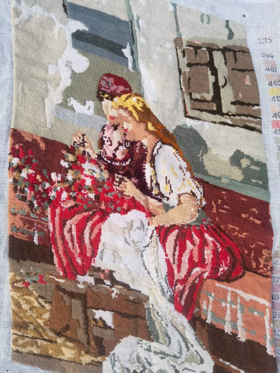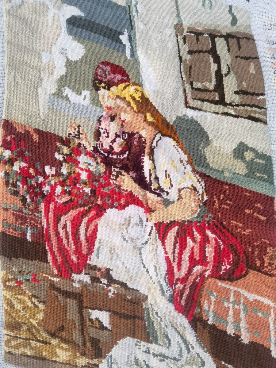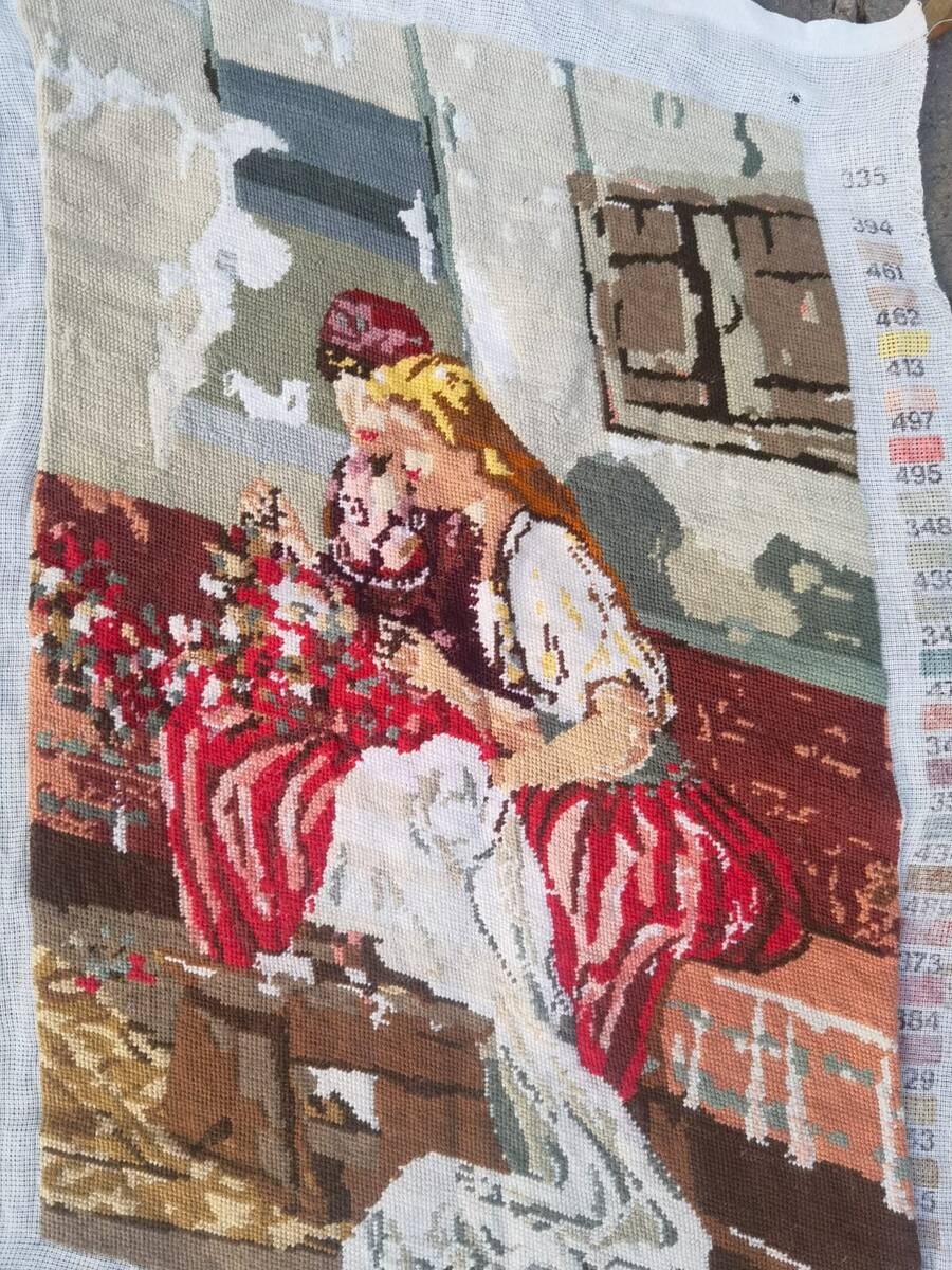 Embroidery in progress young girls vintage cross stitch tapestry, handmade