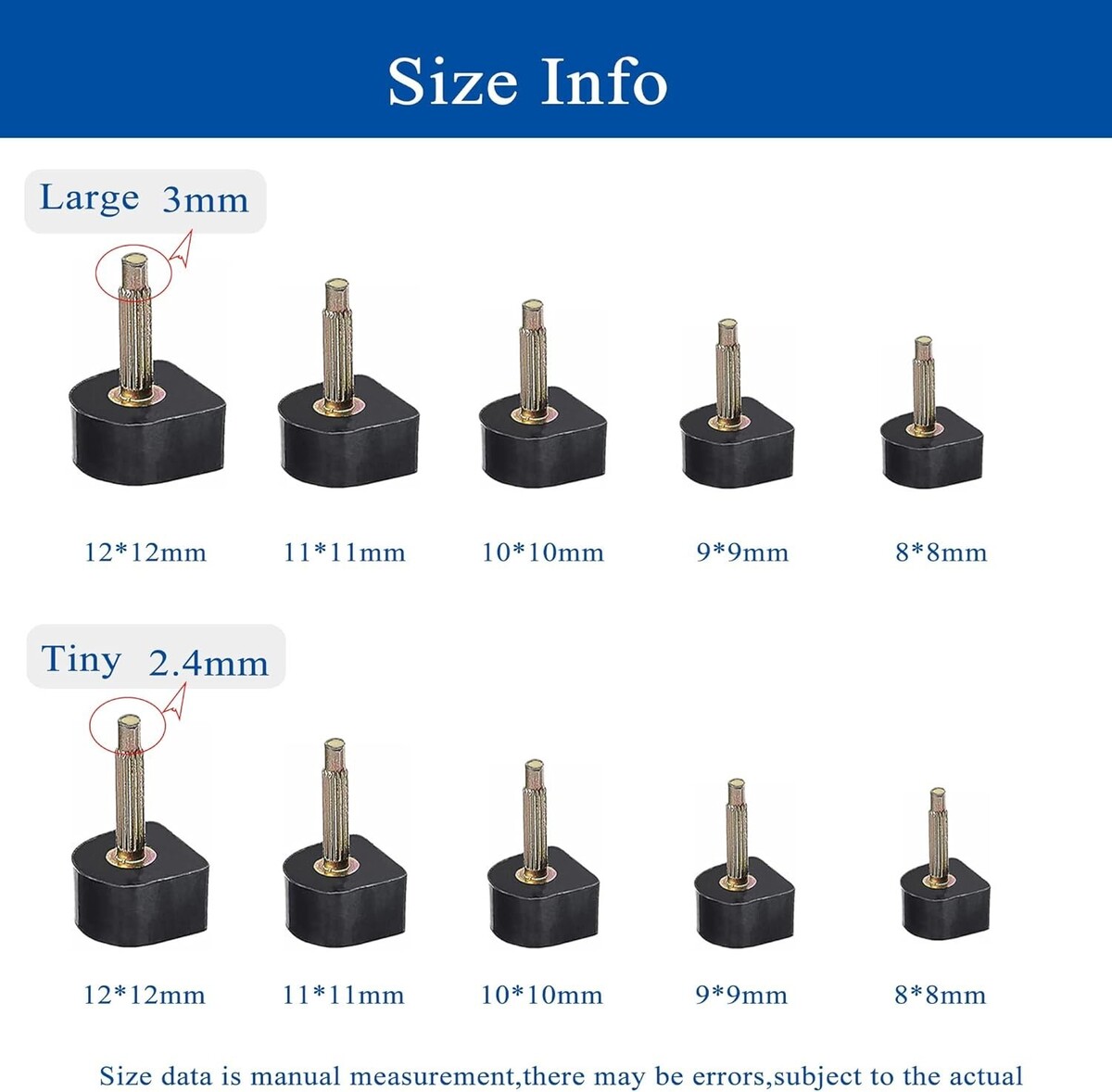 20 pairs of heel tips in 5 sizes: 8 mm, 9 mm, 0 mm, mm, 2 mm, and 2.5 mm.