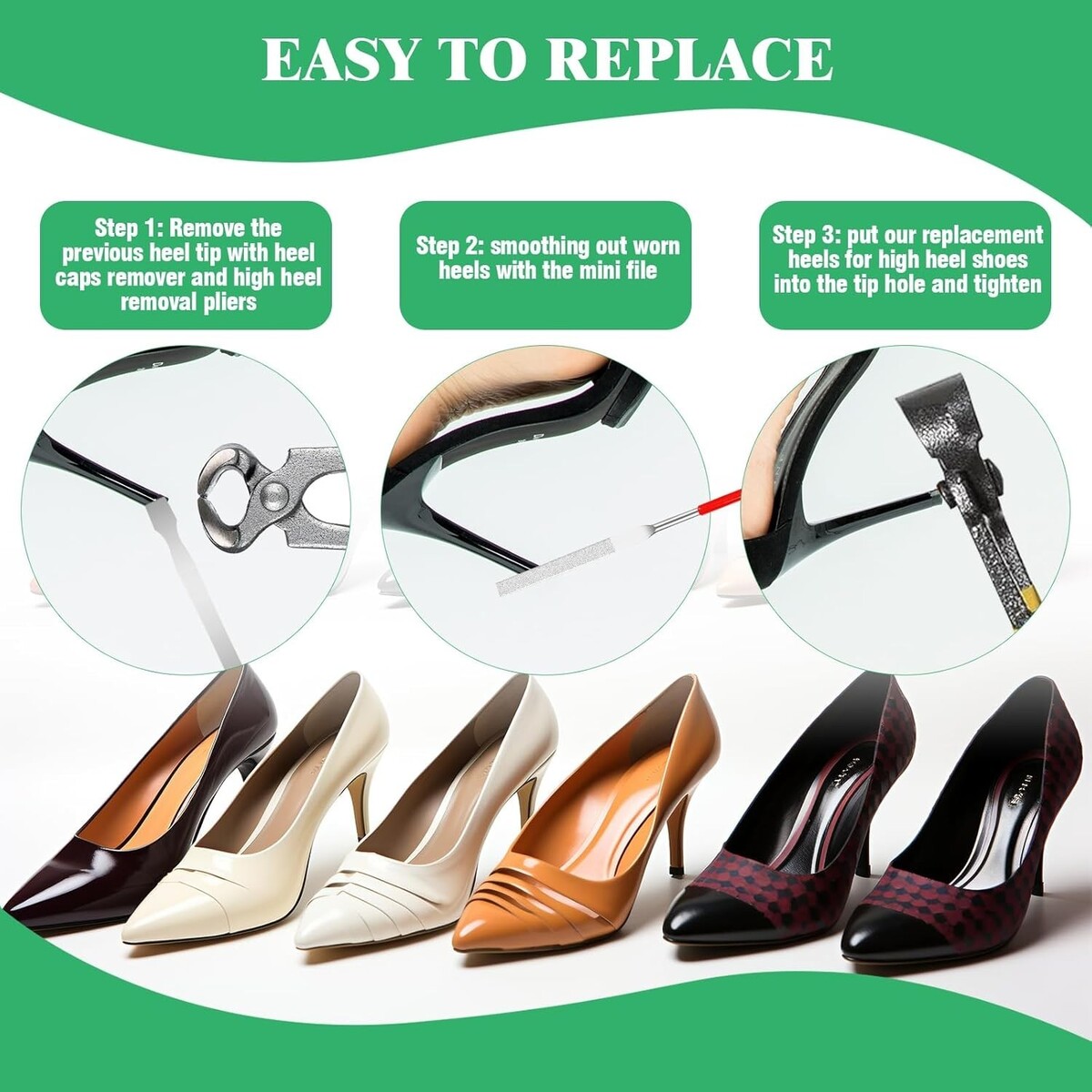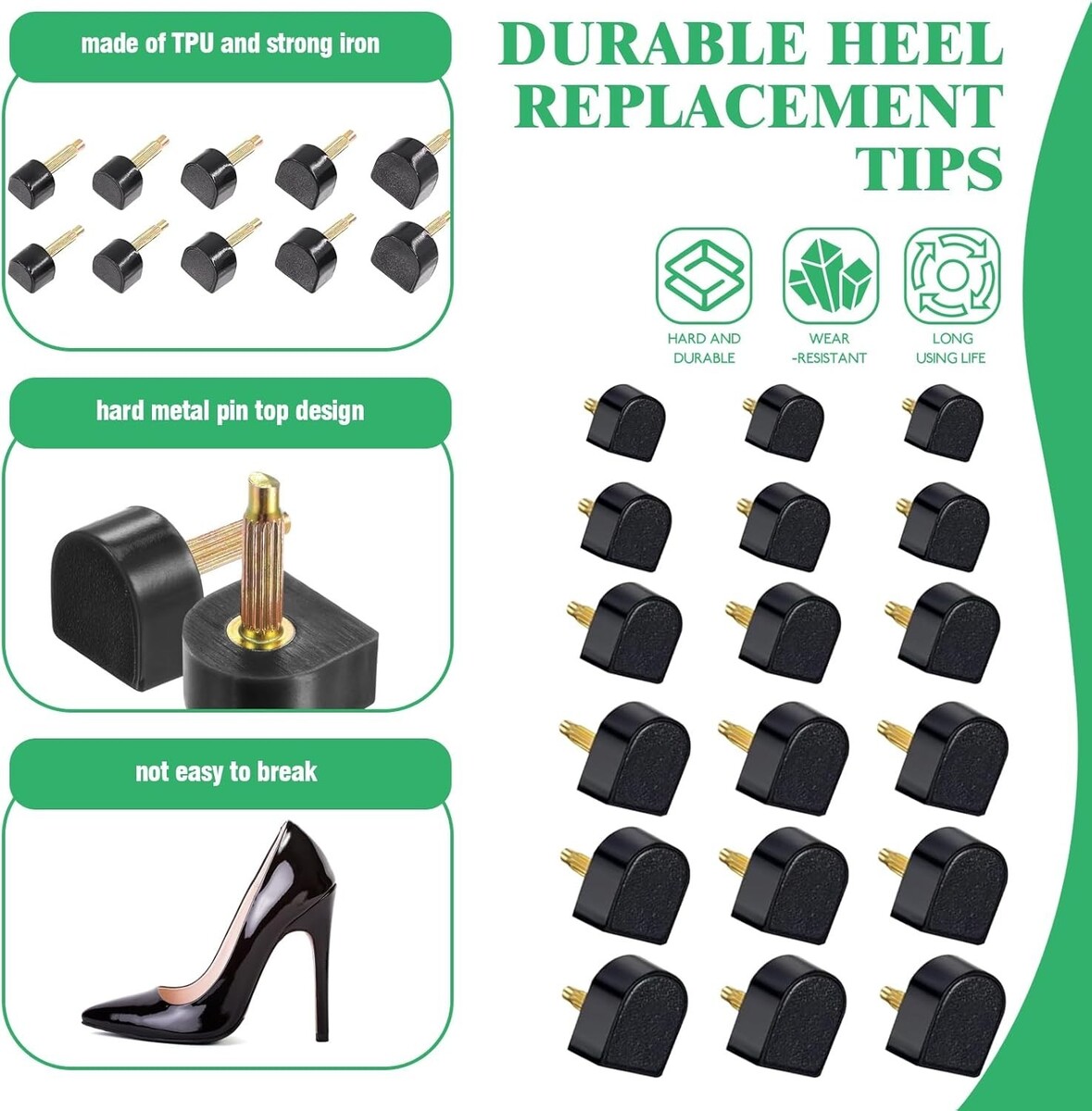 Comprehensive assortment of heel replacement tips ensures compatibility with a range of high heel styles.