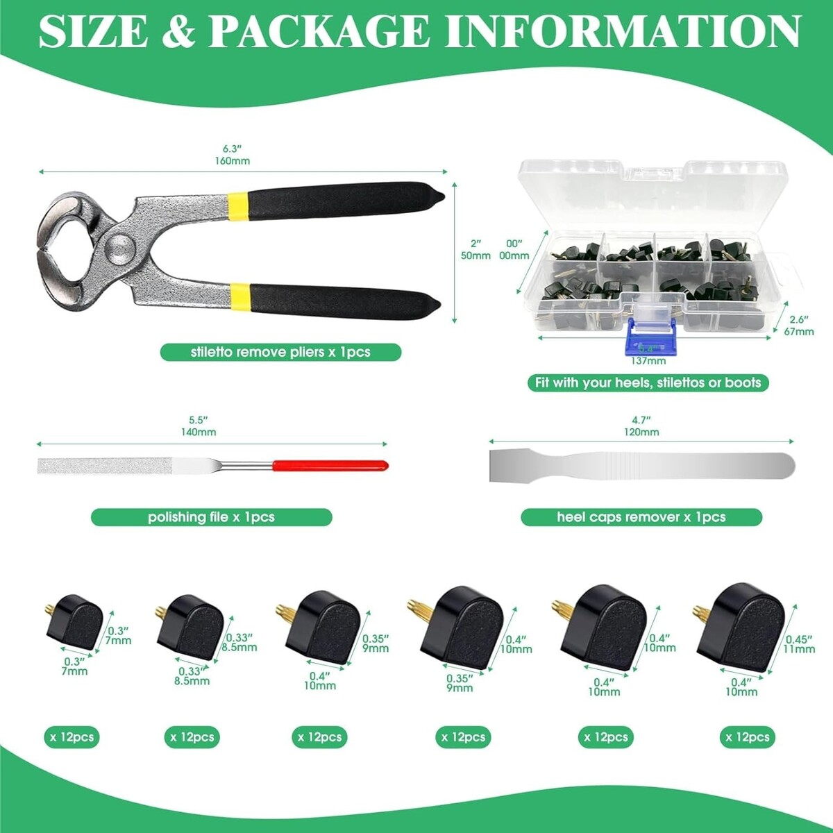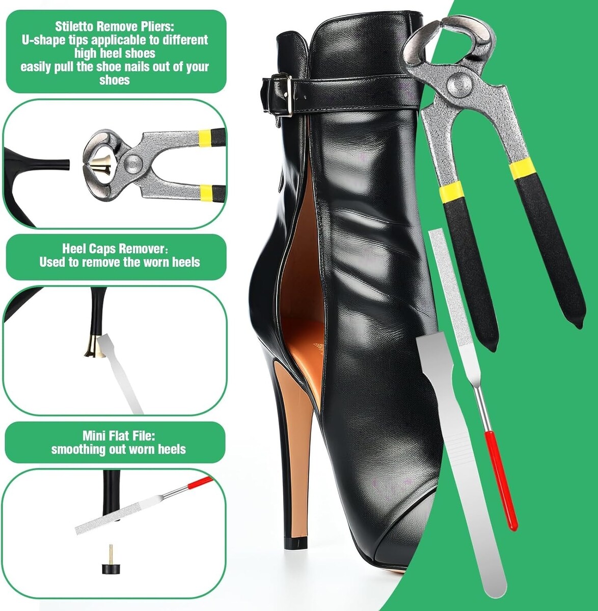 Includes essential tools: 1pc stiletto removal pliers, 1pc heel caps remover, and 1pc polishing file.