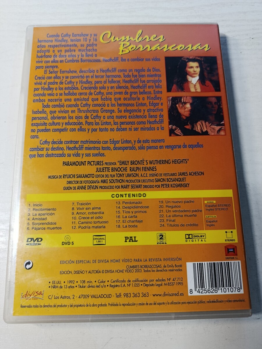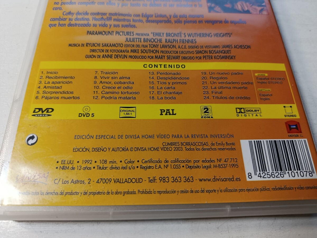Adaptation cinematographique de celebre roman de Emily Bronte. La historia raconte la relation intense et orageuse entre Cathy Earnshaw et Heathcliff, marquee par la passion, el et la vengeance, dansel paysage accidentedelos Maures anglaises. Une ?uvre de emotions extremes, d?amours impossibles et de blessures que traversent les generations. L'une de adaptations les plus reconnues de Les Hauts de Hurlevent, mis en valeur par la puissante performance de Ralph Fiennes como de Heathcliff et sa sensibilite dramatiquede Juliette Binoche. Edition tres interessante para les collectionneurs car elle deun lancement special lie au magazine Inversion, moins courantque les editions commerciales standards. Nous sommes bases en Espagne et proposons des articles soigneusement organises: Records vinyles,