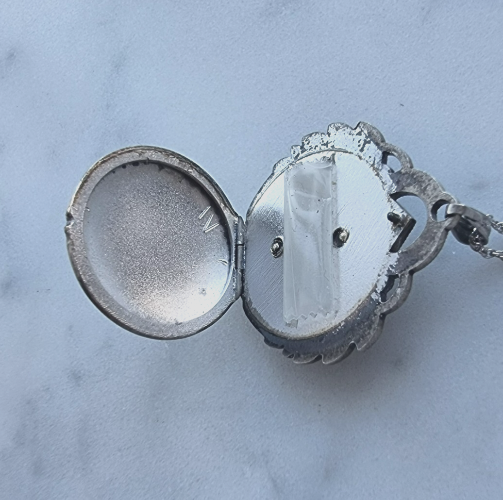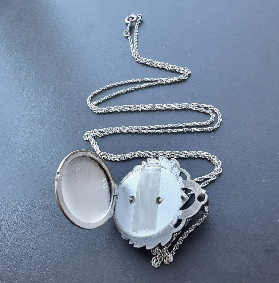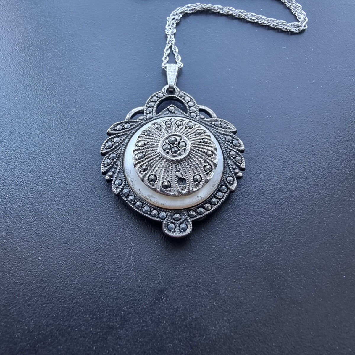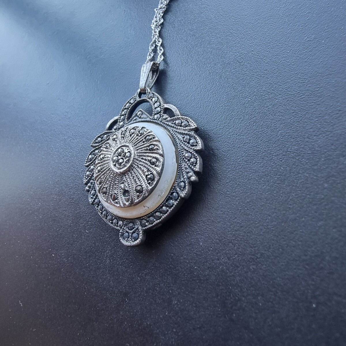 VINTAGE 925 STERLING SILVER MOTHER OF PEARL AND MARCASITE LOCKET NECKLACE 24"