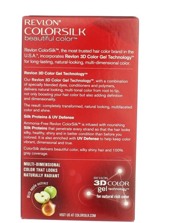 This specially blended, permanent hair color formula includes Revlon 3D Color Gel Technology?, depositing rich, dimensional color that looks natural and lasts. ColorSilk Beautiful Color? provides 100% gray coverage-guaranteed. UV Defense helps shield color against fading, keeping your shade bright and true. Our formula, with nourishing silk proteins, leaves your hair in better condition than before you colored it. Ammonia-free and now with added keratin.