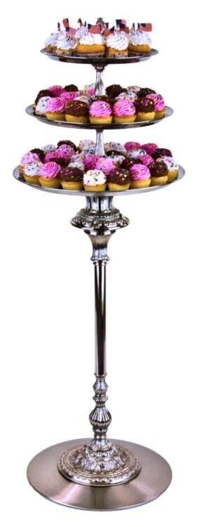 Three-Tiered Tray Create a Single Station Ideal for Self-Serve. It Features Mirror Polished, Stainless Steel, Round Trays and Bright Brass-Plated Gold TRAY Columns and Base. Stand is Bright Nickel-Plated Silver. The Large Footprint Allows for Stability in a Crowded Room without Sacrificing the Shear Elegance and Grandeur of the Stand.