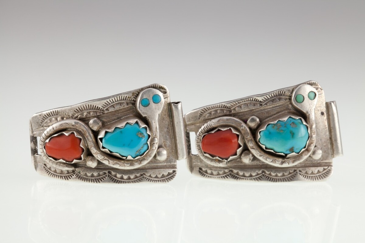 Sterling Silver Zuni Turquoise and Coral Watch Links