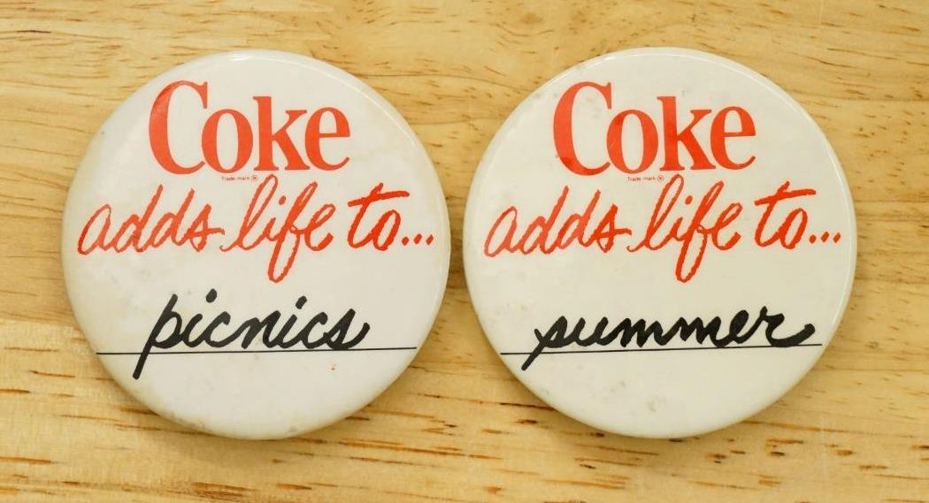 Vintage Pinback Button COKE Adds Life To Summer Picnics Coca Cola Soda Pop. Measures 2.25" tall. (2) buttons in this lot.
