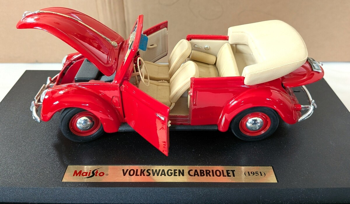 Maisto 1:18 Die Cast Special Edition Volkswagen Cabriolet (1951) diecast model. New old stock (NOS) in excellent condition. Box has some slight scuffing on the edges but very solid otherwise.