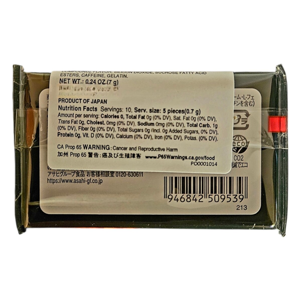 Sweeteners (sorbitol, aspartame, L-phenylalanine compound), fragrance, fine silicon oxide, chosaccharide ester, caffeine, carotenoid pigment, (some of the raw materials include gelatin)