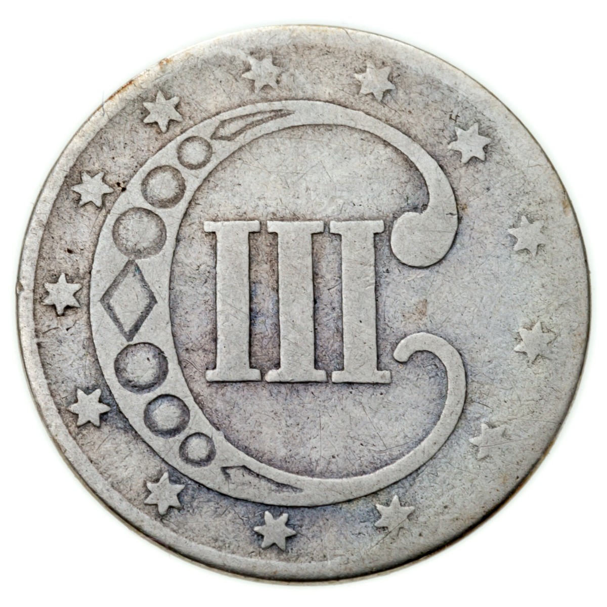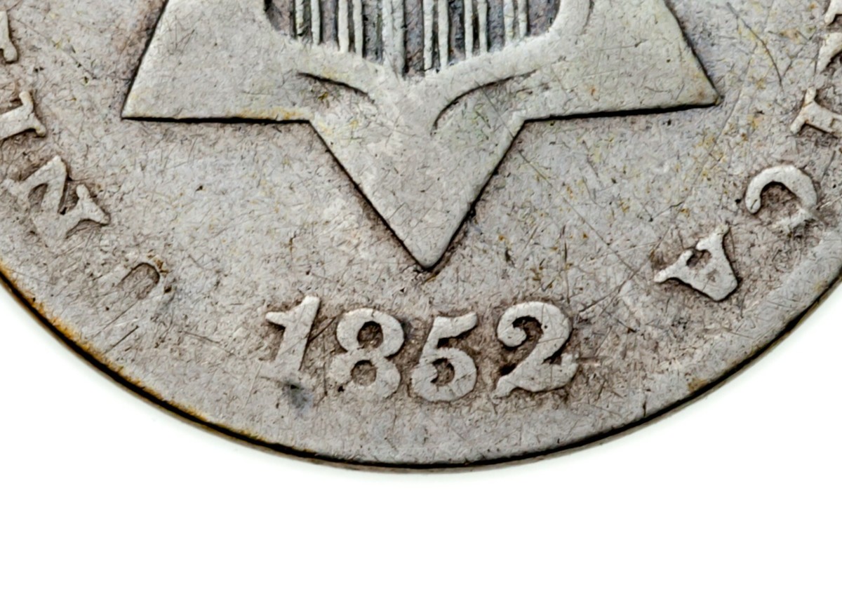 1852 Piece en argent de 3 cent en bon etat, jantes pleines, couleur grise