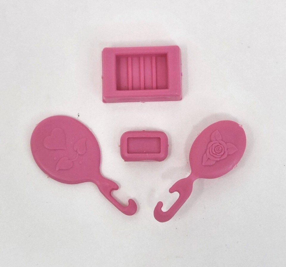 VINTAGE MATTEL BARBIE PINK ACCESSORIES BRUSH W FLOWERS + MIRROR W HEARTS + SOAP