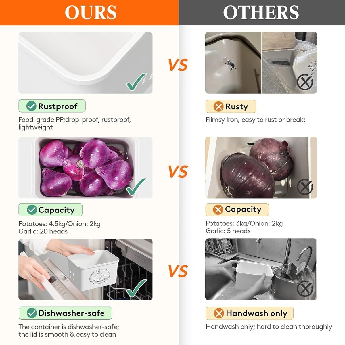 Large Capacity: Efficiently organize and store your essentials?hold up to 4.5 kg of potatoes, 2 kg of onions, and 20 heads of garlic effortlessly.