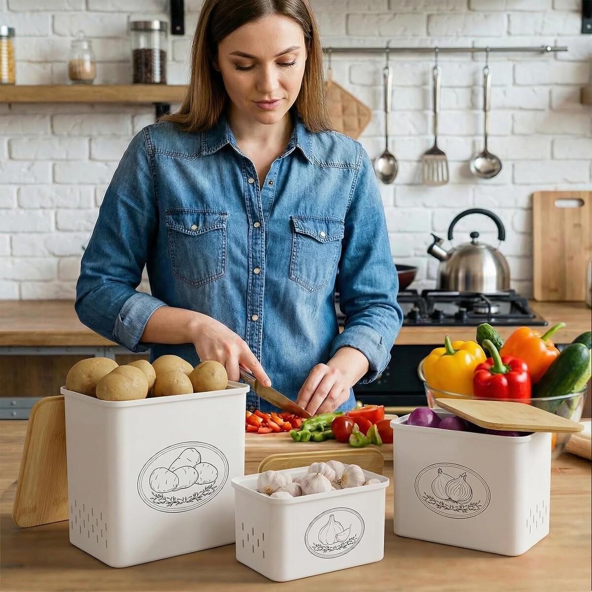 Set Includes: Lid,Potato storage bin,Onion storage bin,Garlic storage bin,Bamboo lid