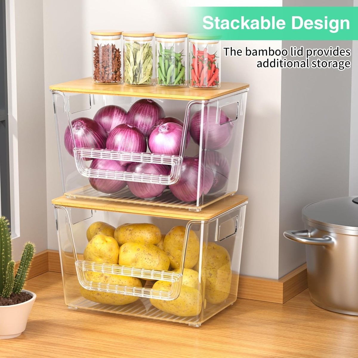 Versatile Stackable Potato Onion Storage Bins with Bamboo Lids - Clear Design