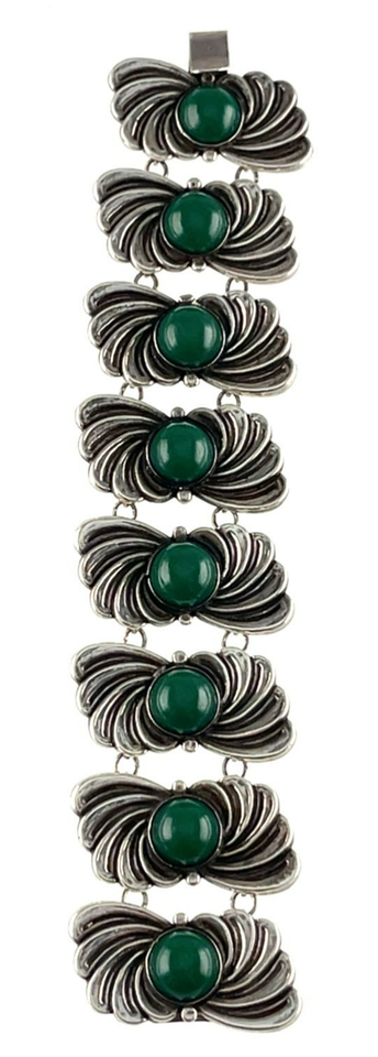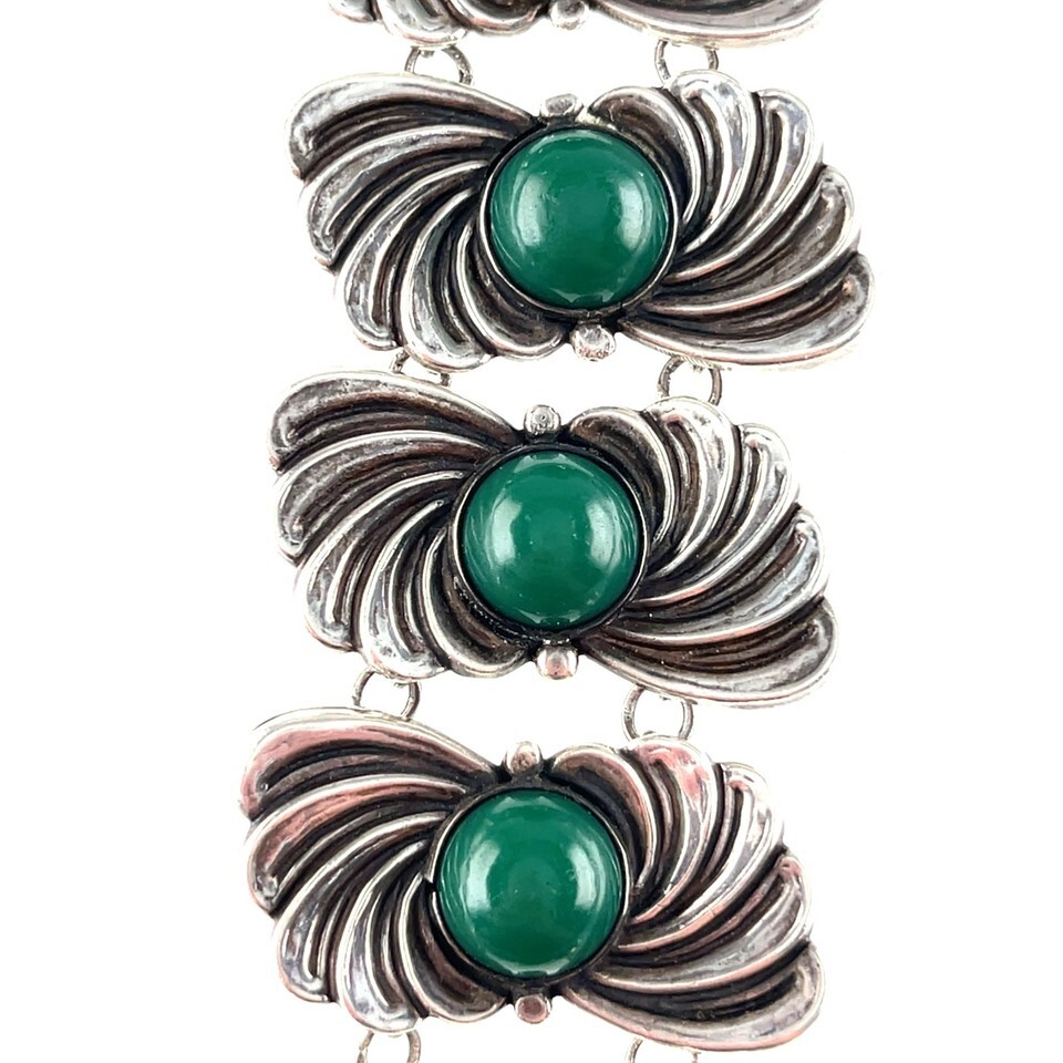 Vintage Taxco Mexico Sterling Silver Green Stone Panel Bracelet 7.25"