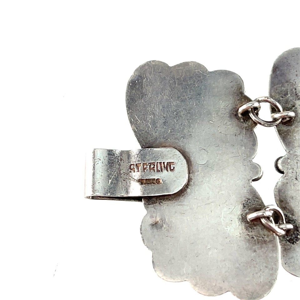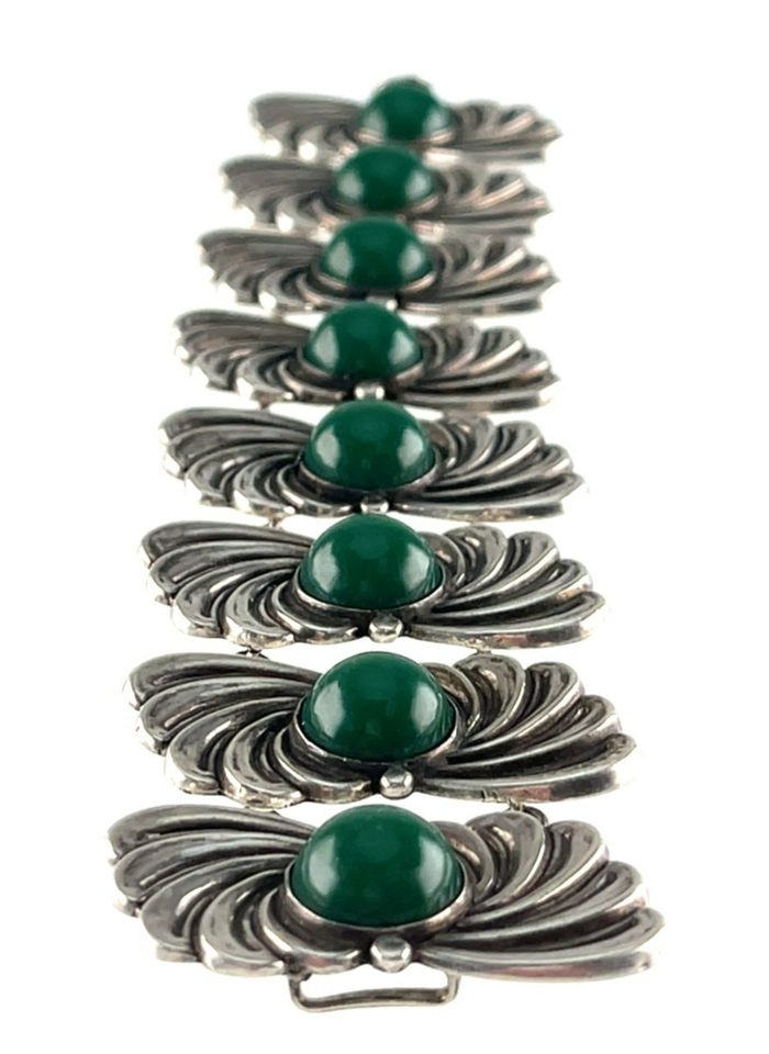 Vintage Taxco Mexico Sterling Silver & Green Stone Panel Bracelet 7.25"