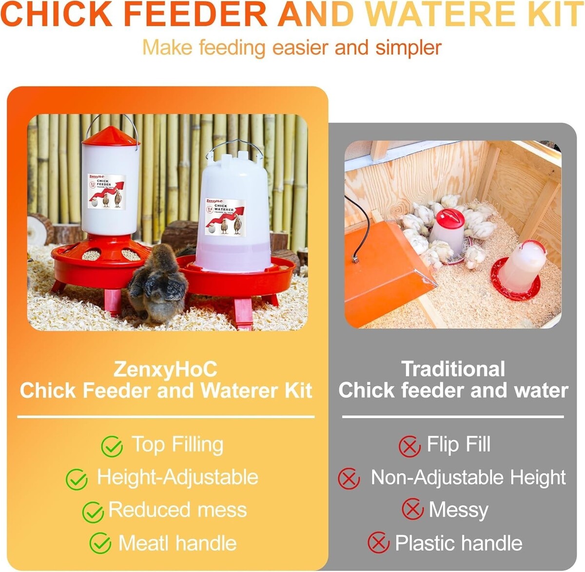 Adjustable Height for Growing Chicks: Both the feeder and waterer come with 3 adjustable height settings, allowing for optimal accessibility as your chicks mature.