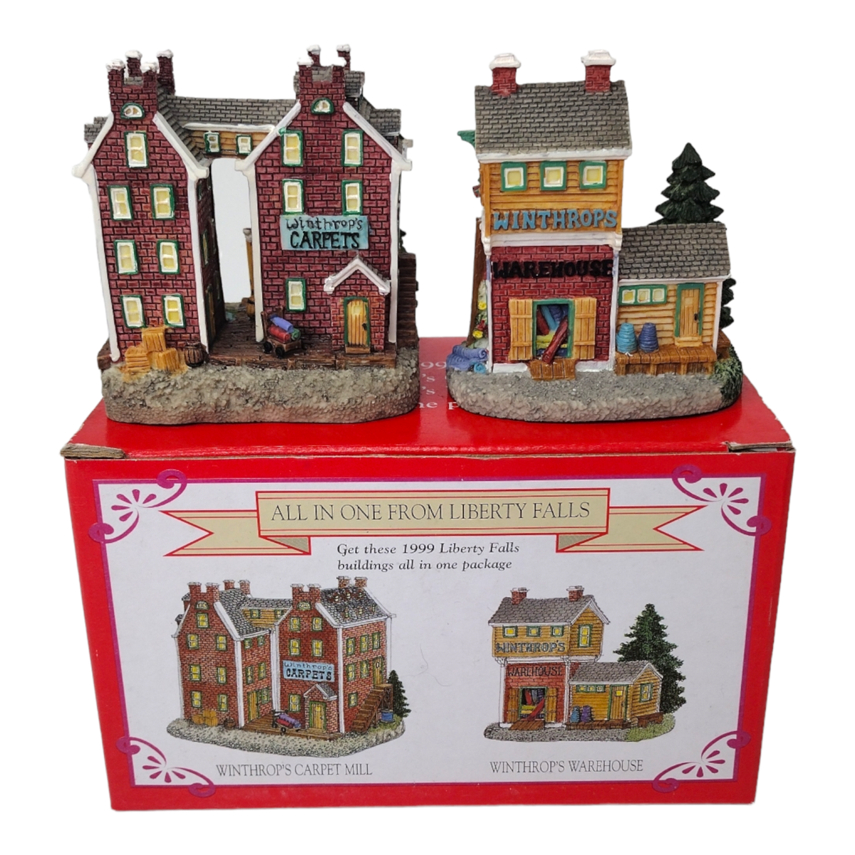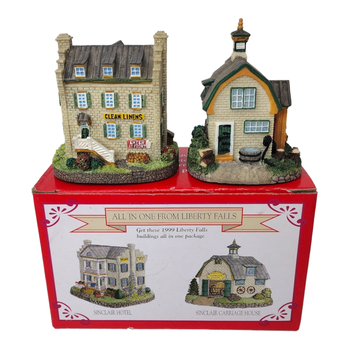 Lot of 3 Liberty Falls All in One and 1 The American Collection Miniature Houses. Pre-owned in good condition. No chipped or cracked parts. All have the original boxes. The All in One houses are: Sinclair Hotel, Sinclair Carriage House, Winthrop's Carpet Mill, Winthrop's Warehouse, Rosies Flower Shop, and Rosie's Greenhouse (weathervane is kept separate on this house). The American Collection house is Swanson's Feed Grain. Boxes have some normal wear from storage and age. See all photos for details and condition. Will ship USPS Priority Mail.