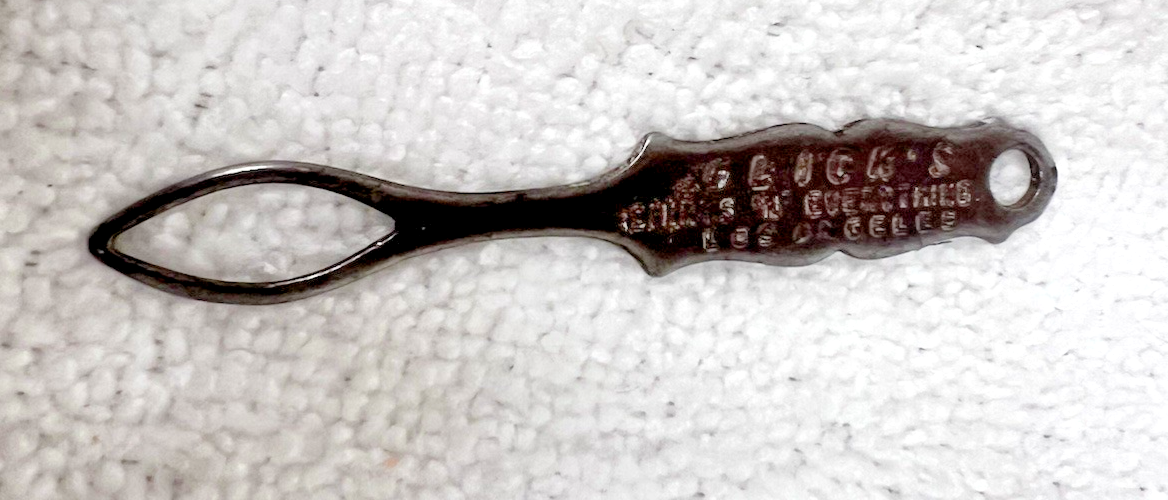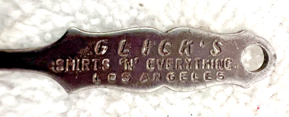 Vintage Metal Glicks Shirts Los Angeles Clothing Advertising Button Hook. Antique vintage Los Angeles California Glick's Shirt "N" Everything reads the advertising clothing button hook, measures approx. 3 1/8" long, no damage, some wear to lettering, overall good used condition. See pictures.