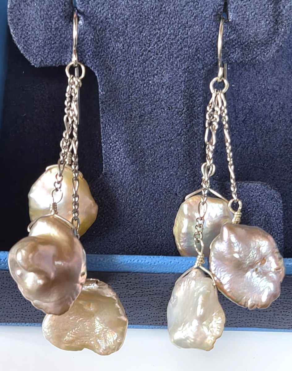 925 Sterling Silver Keshi Baroque Pearl Dangling Hook Earrings 2.1/8" Long