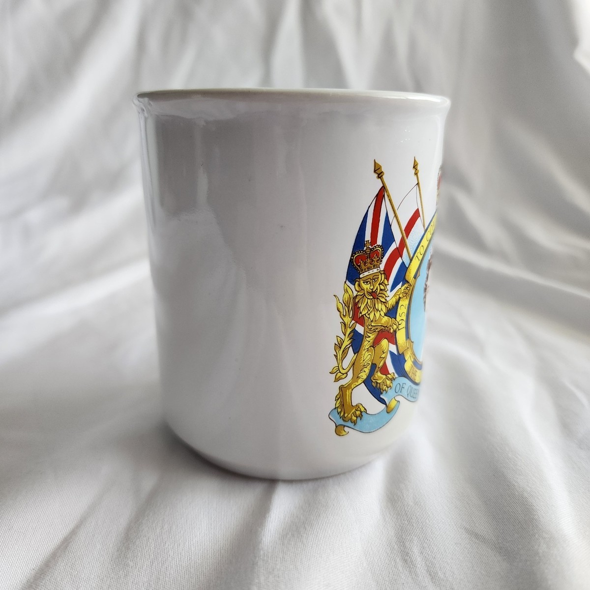 The Queen Elizabeth II Silver Jubilee 1952 1977 Cup Coffee Tea Mug Vintage is a collectible piece of dinnerware featuring a white toleware style. Made by Midwinter, this vintage mug commemorates the Silver Jubilee of Queen Elizabeth II in 1977. Perfect for serving coffee or tea, this unique and nostalgic piece adds a touch of British charm to any kitchen or dining area.