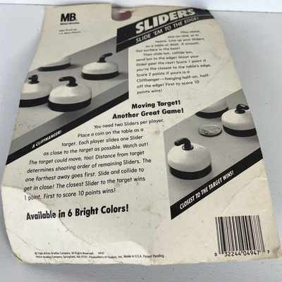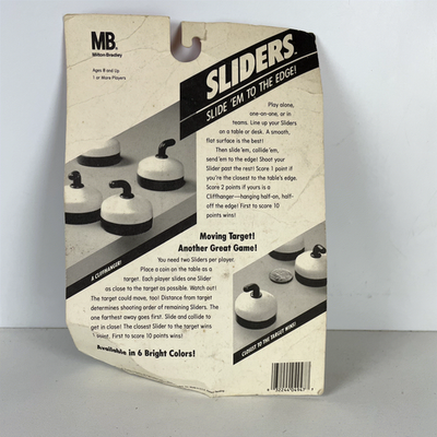 This classic game features durable plastic Slider pieces, designed to glide smoothly across any flat surface. The package displays the iconic 80s Milton Bradley branding and vibrant artwork, showcasing the game's simple yet addictive mechanics. Whether you're a collector of retro games, seeking nostalgic fun, or introducing new generations to vintage tabletop entertainment, SLIDERS offers timeless appeal and competitive excitement. Embrace the challenge to "Take 'Em to the Edge" and master the art of the slide!