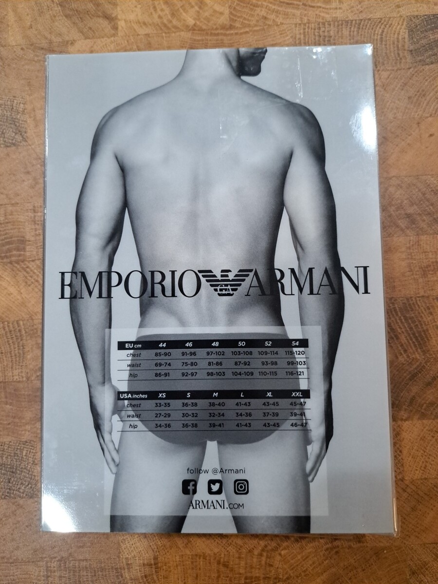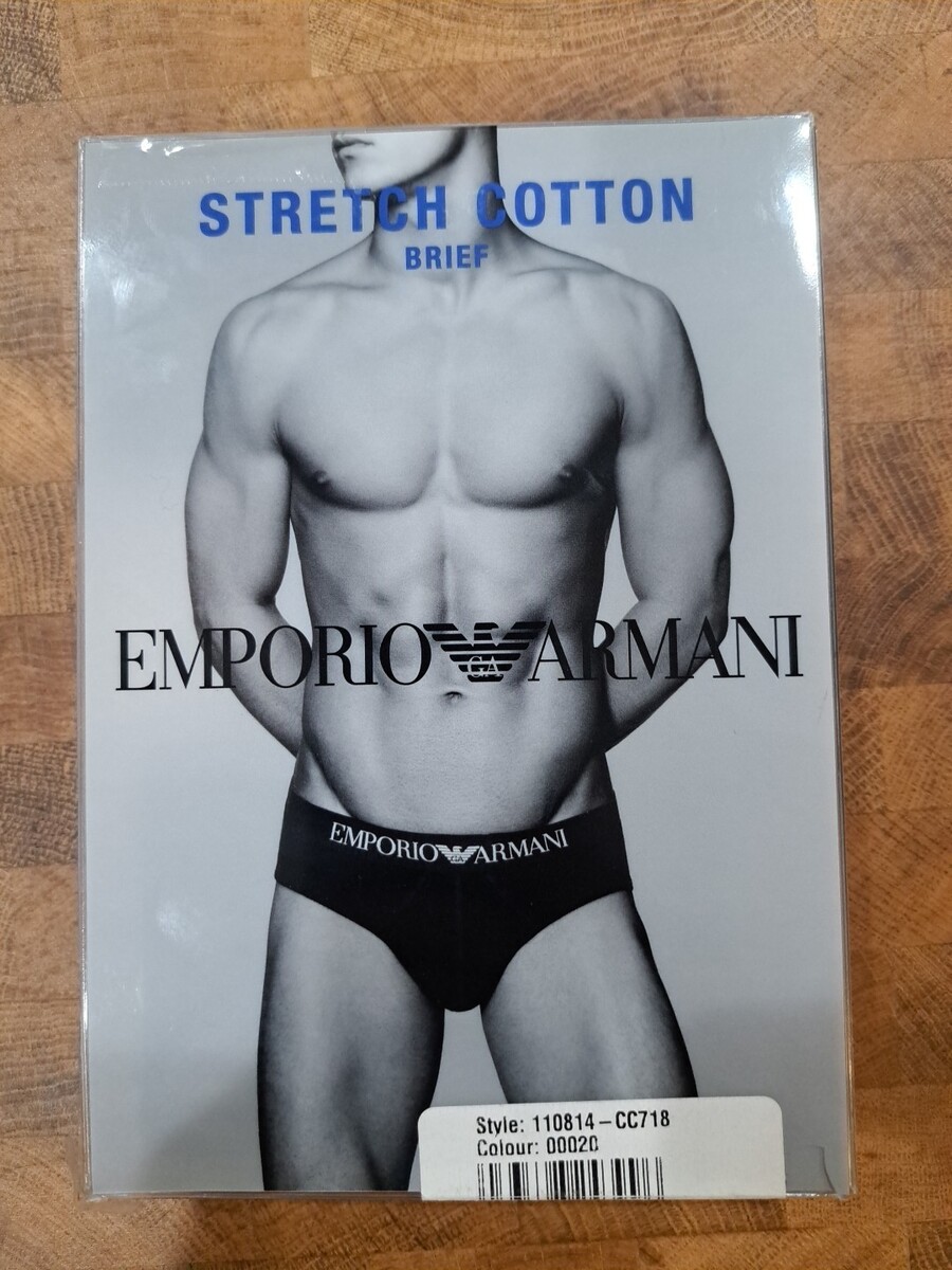 Emporio Armani Essentials Stretch Cotton Brief (110814A). Single-pack stretch cotton brief offers an enhanced slimmer fit, with updated silhouettes. Perfect for everyday wear. Made of cotton and elastane jersey knit that features a soft cloth finish. Microfiber elastic waistband with Emporio Armani logo at center front. Double-layer, contour pouch keeps you centered. Ribbed trim at leg openings. Seamless side and back. Tag with size and fabric information sewn onto center back interior of waistband. Flyless.