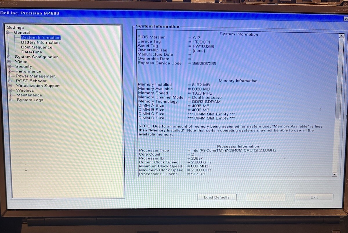 Dell Precision M4600 Motherboard Intel i7-2640M @2.8GHz, 8YFGW, SR03R